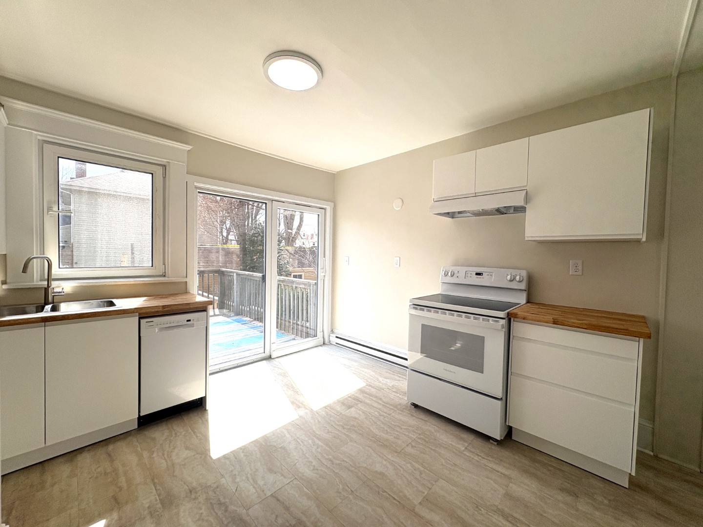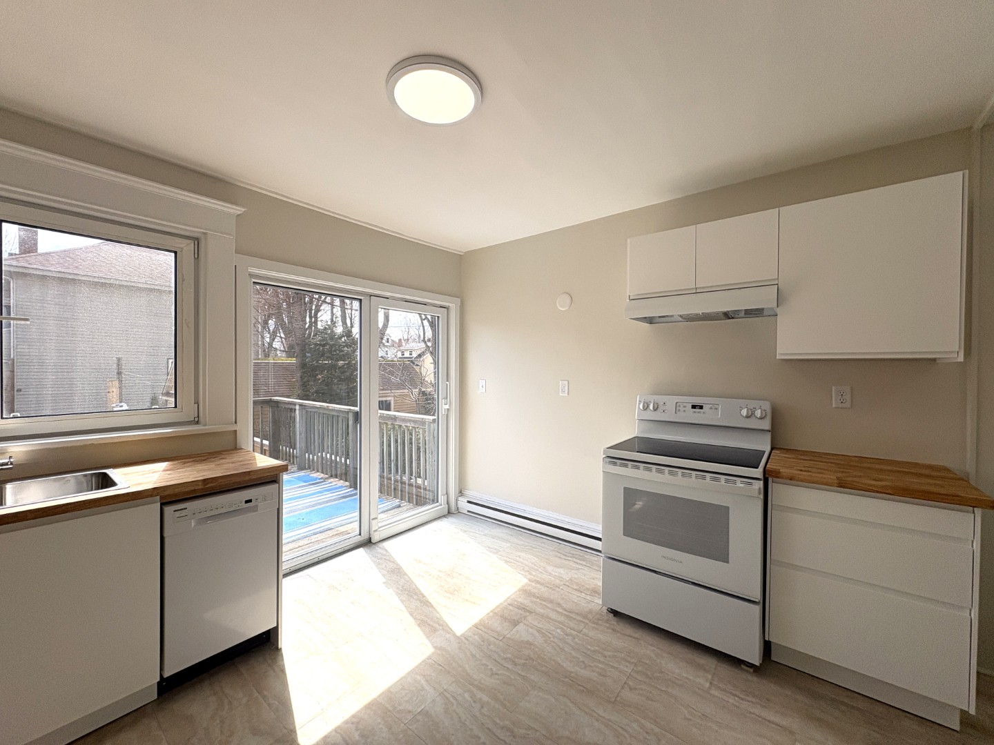 Big living room at the front of the home and two good sized bedrooms. One full bath. Kitchen has just been renovated with new Ikea cabinets, butcher block countertops, new washer/dryer, double sinks and patio doors to your private deck overlooking the sizable, shared yard.