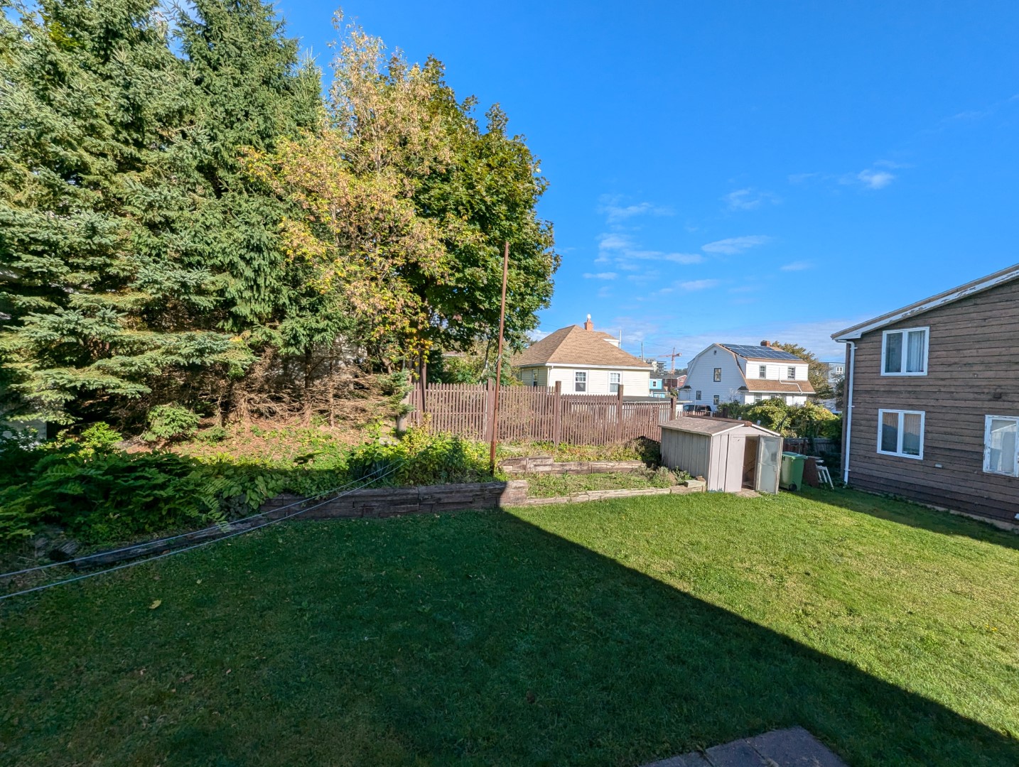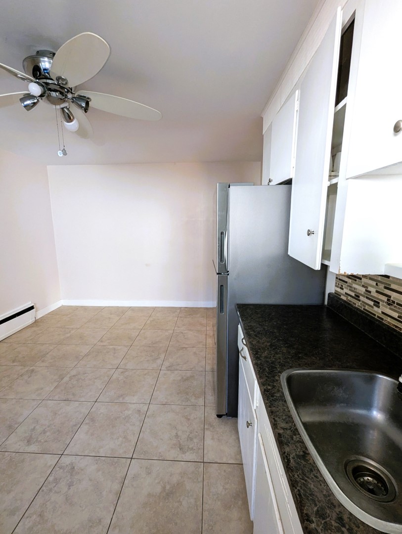 Big, bright living area with hardwood floors. Large kitchen with plenty of cabinetry, plenty of room for a table, and side door to a lovely, shared backyard.