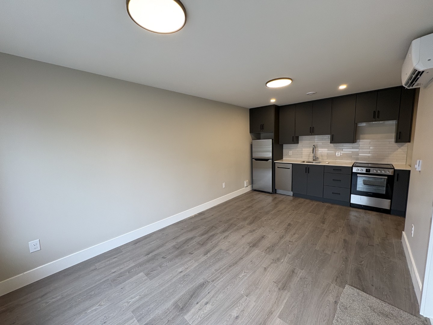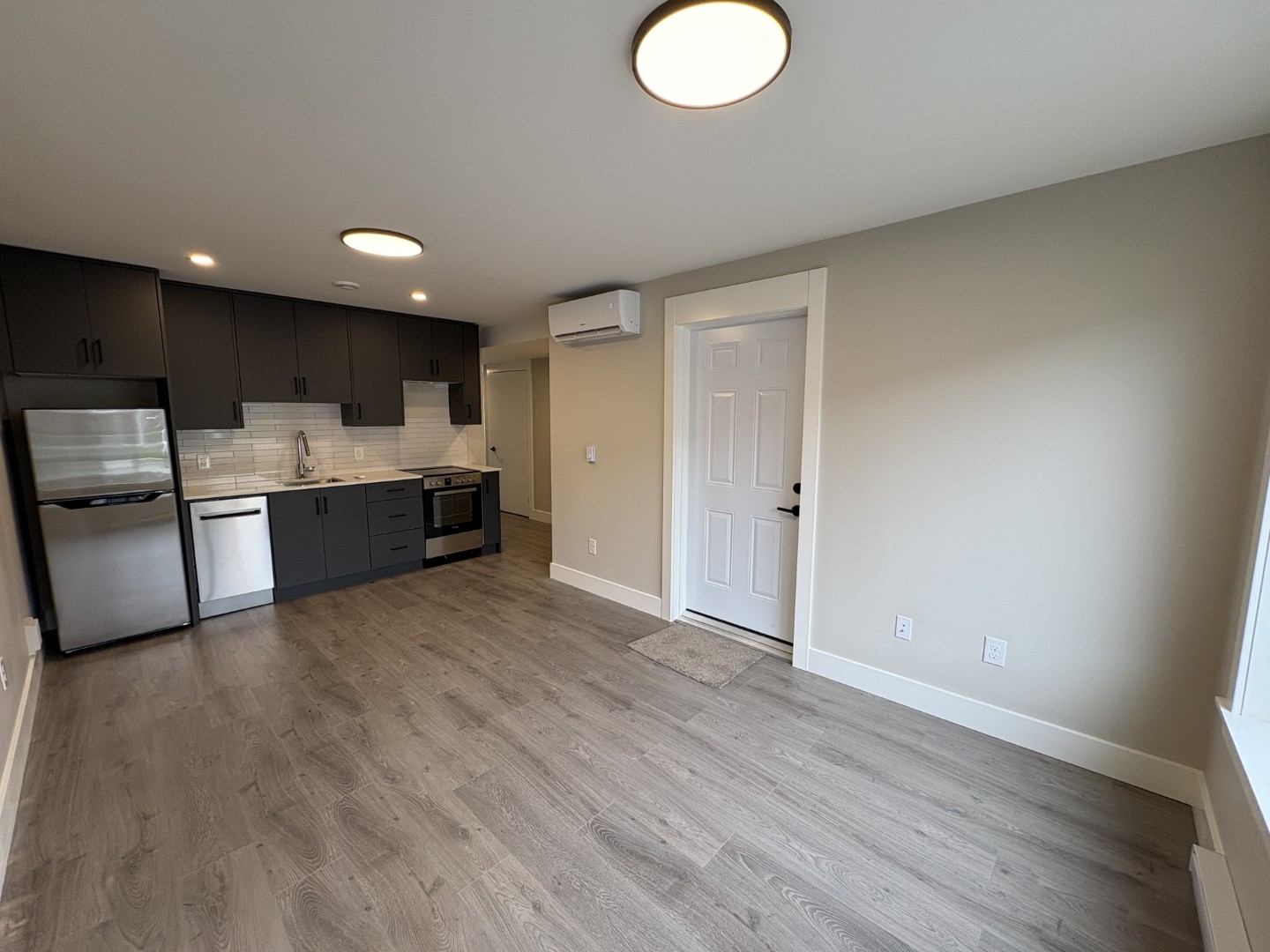 Open concept kitchen, dining and living area. Huge windows in living area flood the space with natural light. All new appliances in kitchen including a dishwasher and rangehood microwave. Two bedrooms and one full bath.