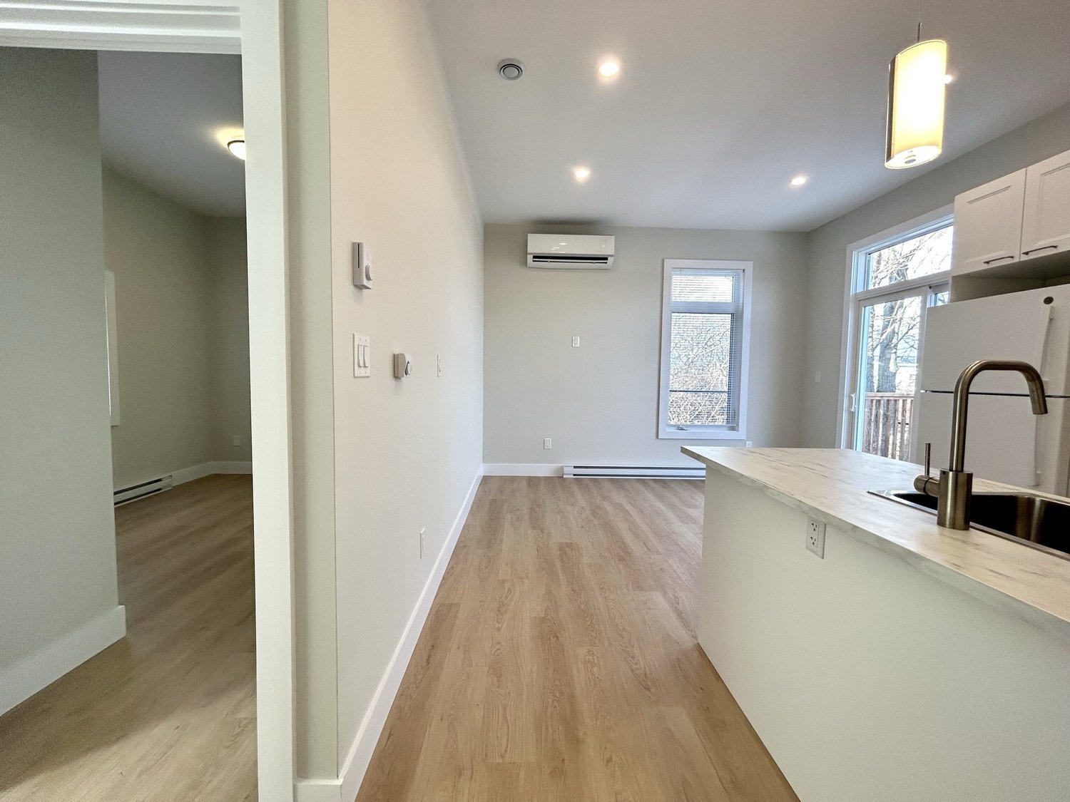 Open concept kitchen, living and dining area with ductless heat pump. Kitchen has fresh, white cabinetry and a large breakfast bar offering ample counter space.