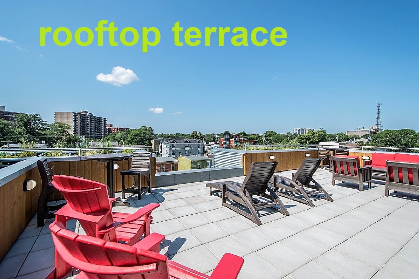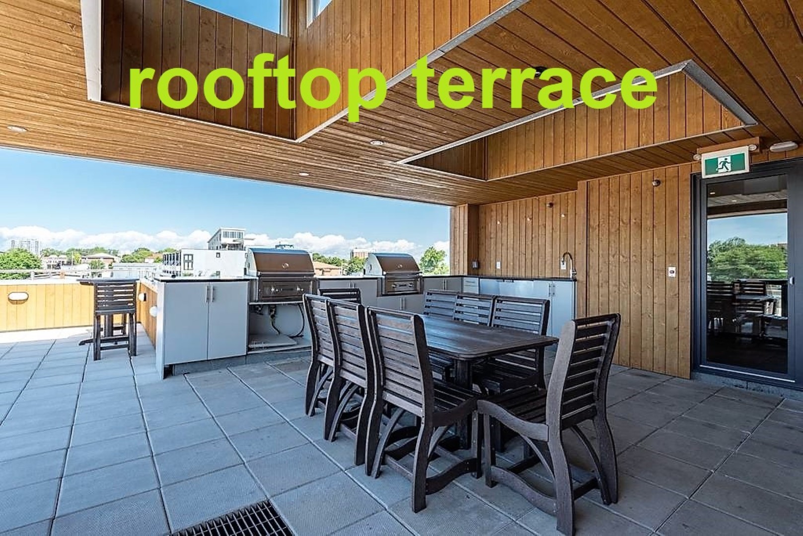 There is a roof top garden/patio with BBQ's, underground parking, and air conditioning in the unit.