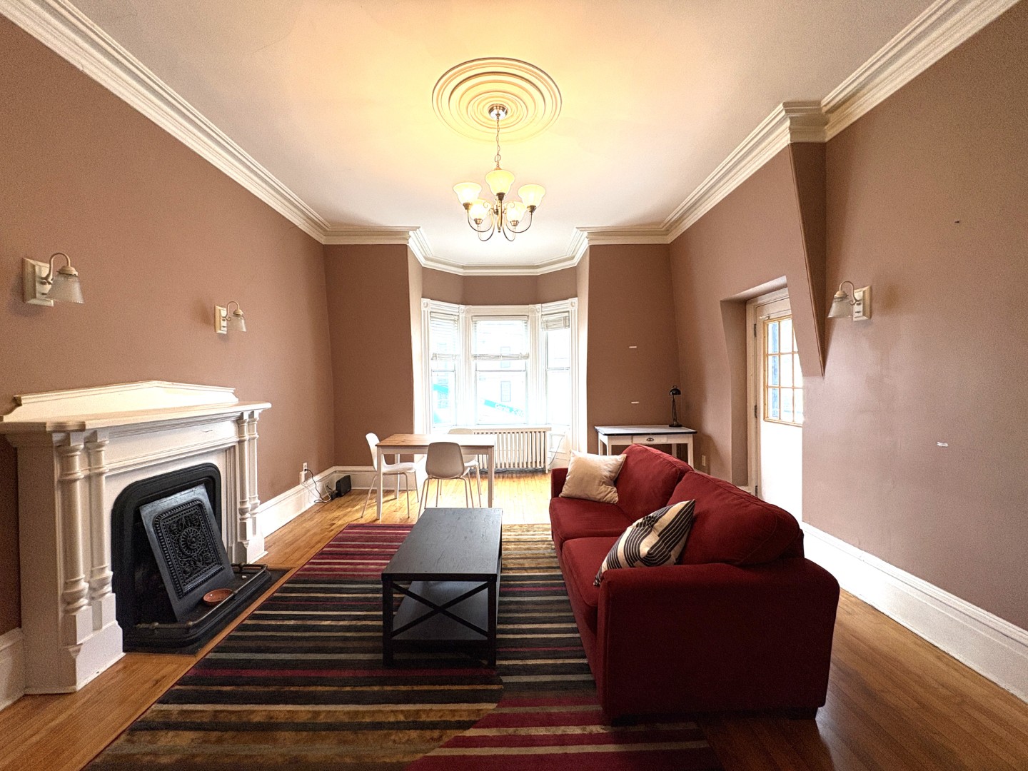 Beautiful hardwood flooring throughout. Large living area with bay window, original ornamental fireplace, plenty of room for a dining table and door to a private balcony. Good sized bedroom with two windows. One full bath and a laundry closet with additional storage space.
