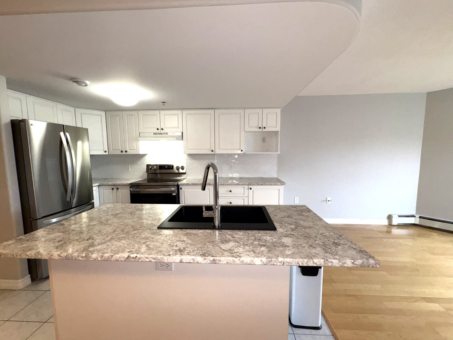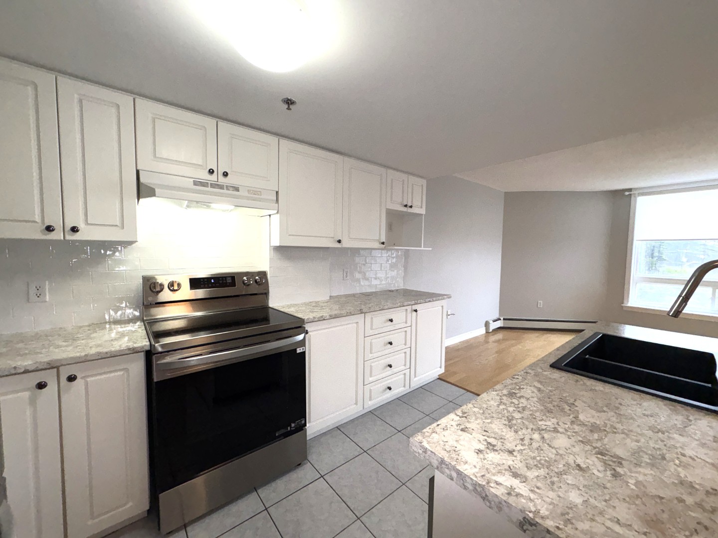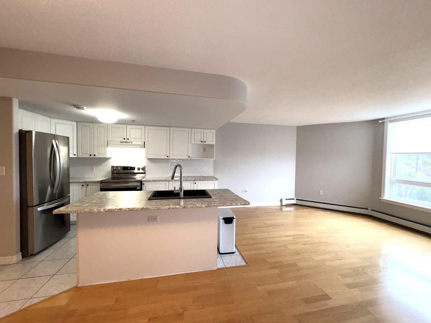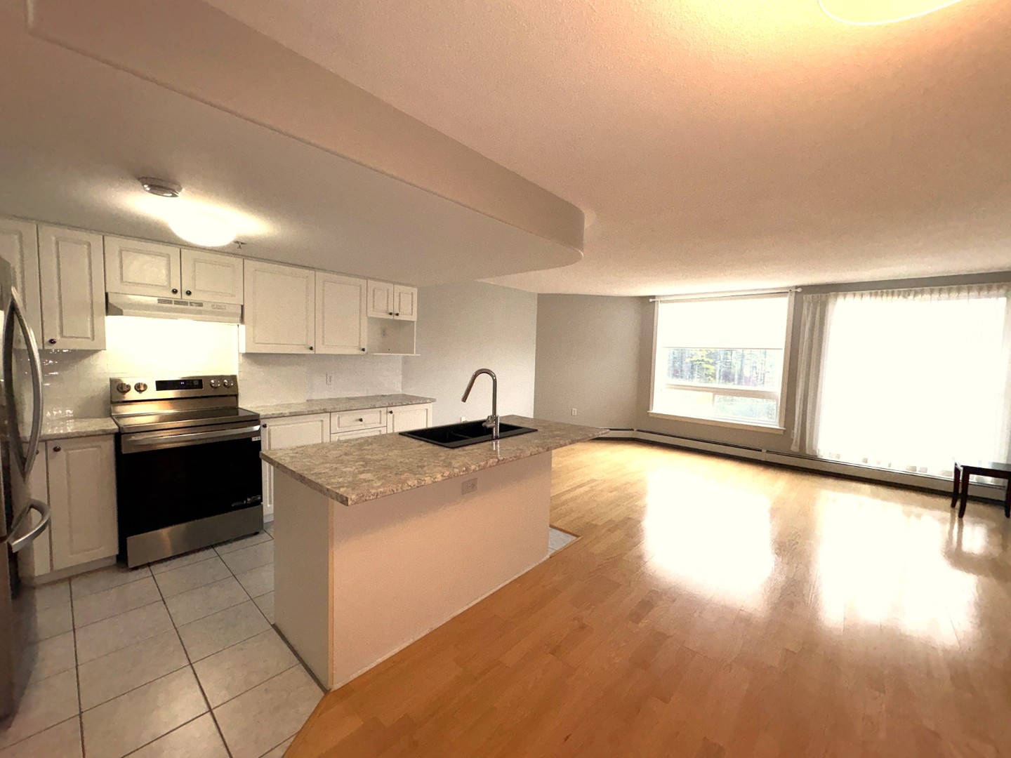 Spacious entry leads to open concept kitchen, living and dining areas. Kitchen recently renovated with new countertops, new stainless-steel appliances and island/breakfast bar which opens seamlessly to the living and dining areas - ideal for entertaining or relaxing. This unit is Southwest facing ensuring plenty of sunshine! Private deck overlooking peaceful green space. Primary bedroom has large walk-through closet and full ensuite with jet tub. Second good-sized bedroom plus second full bath.