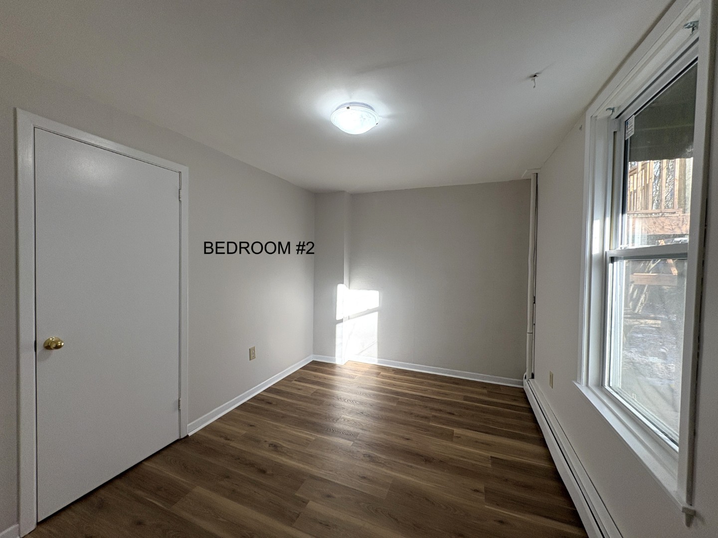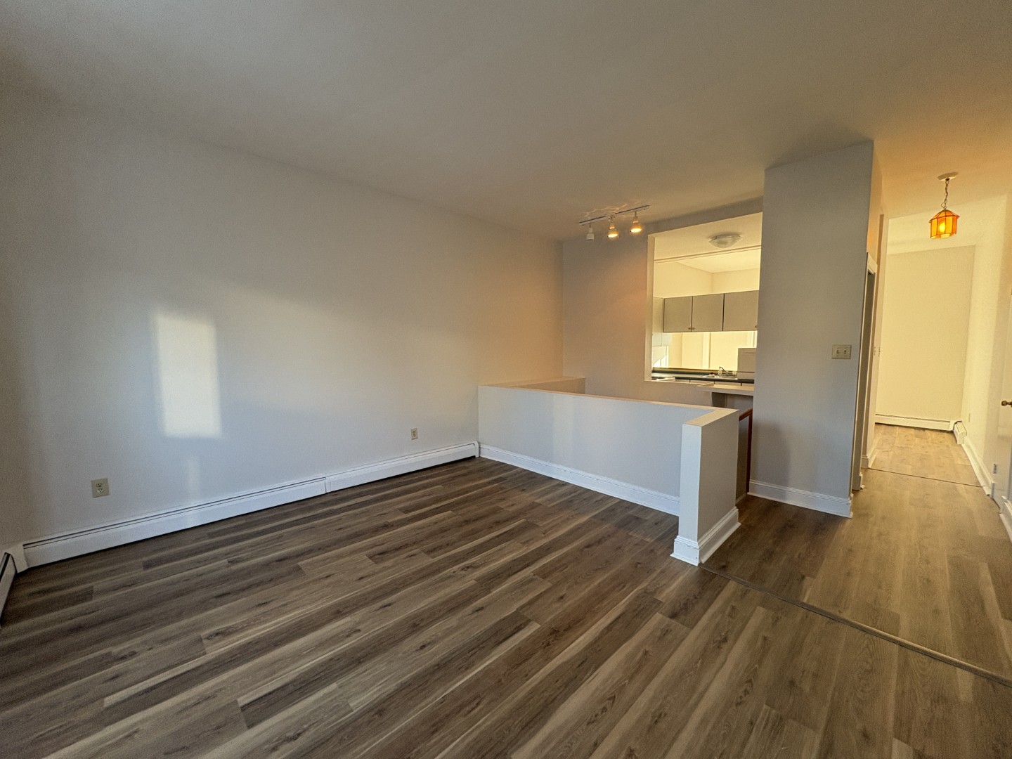 Main floor has a large, bright living room at the front of the building, a galley style kitchen and a dining area with doors to patio at the back. Lower level has two good sized bedrooms and full bath. Laminate flooring throughout with carpet on stairs only.