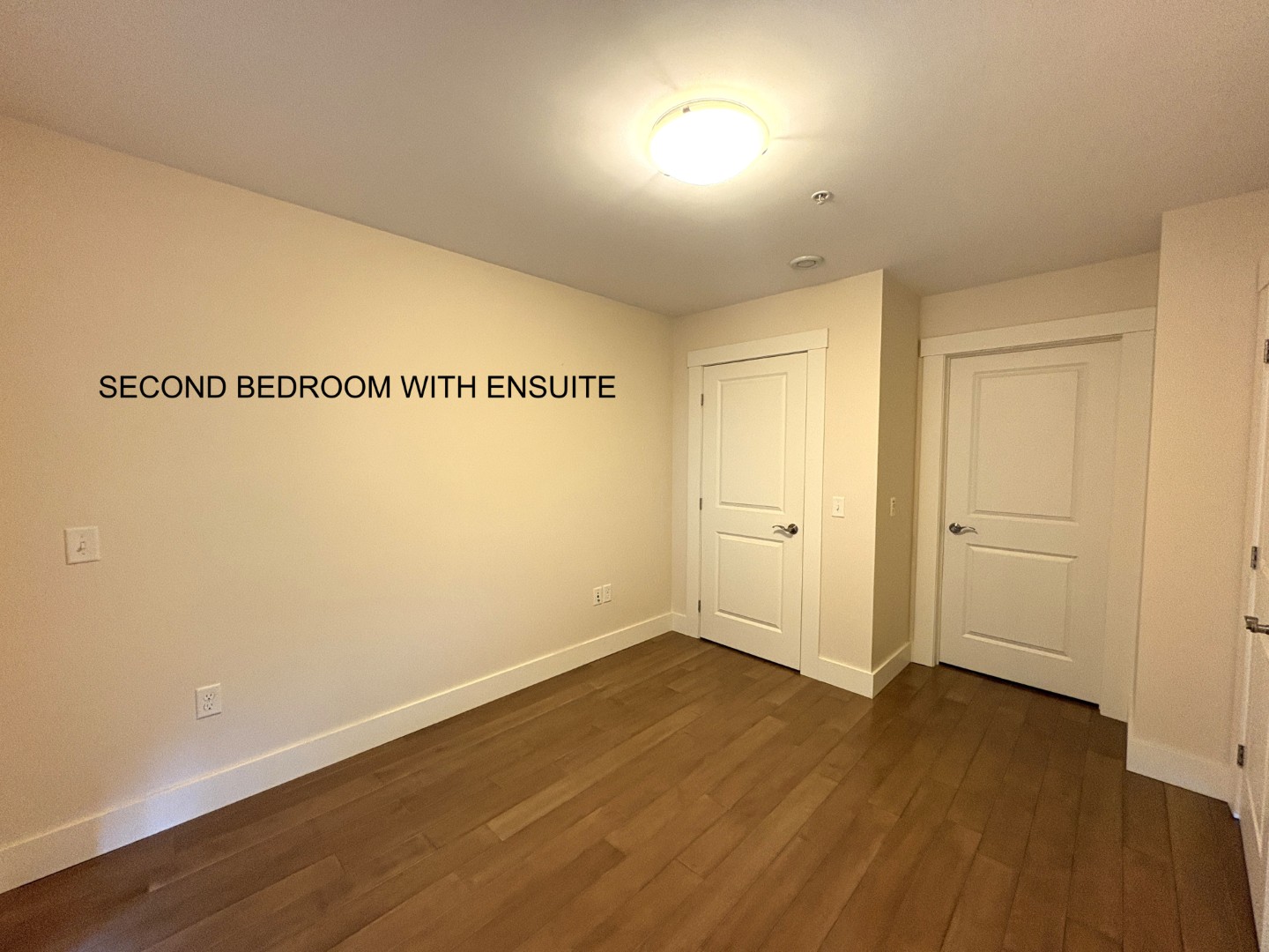Large primary bedroom features a walk-in closet, and a luxurious ensuite bathroom with a deep soaker tub, separate shower, and double vanity. Second good-sized bedroom with a cheater ensuite.