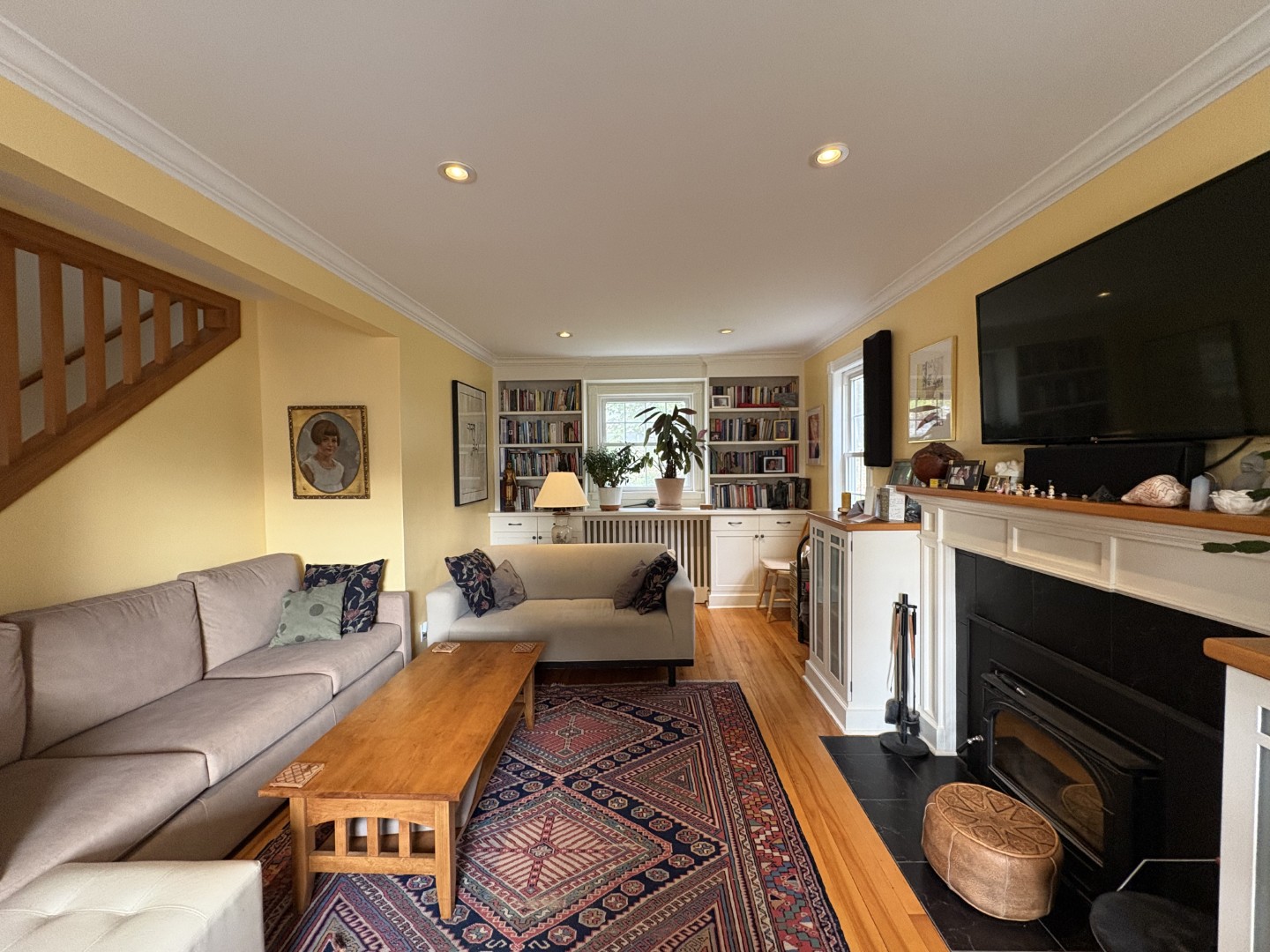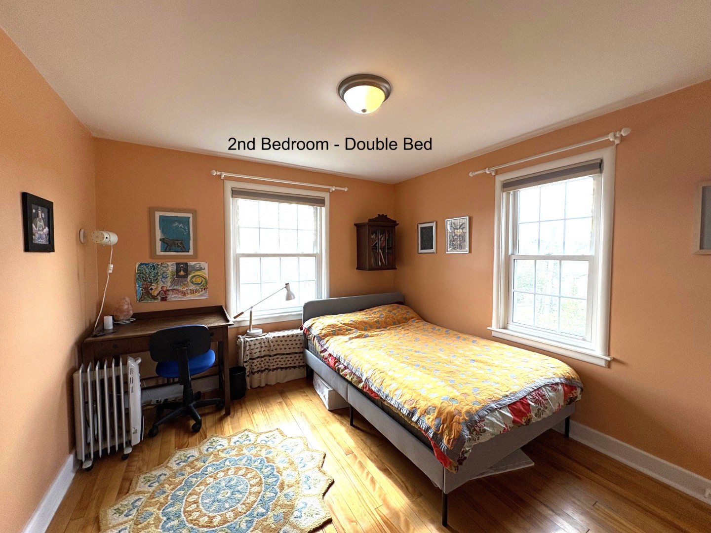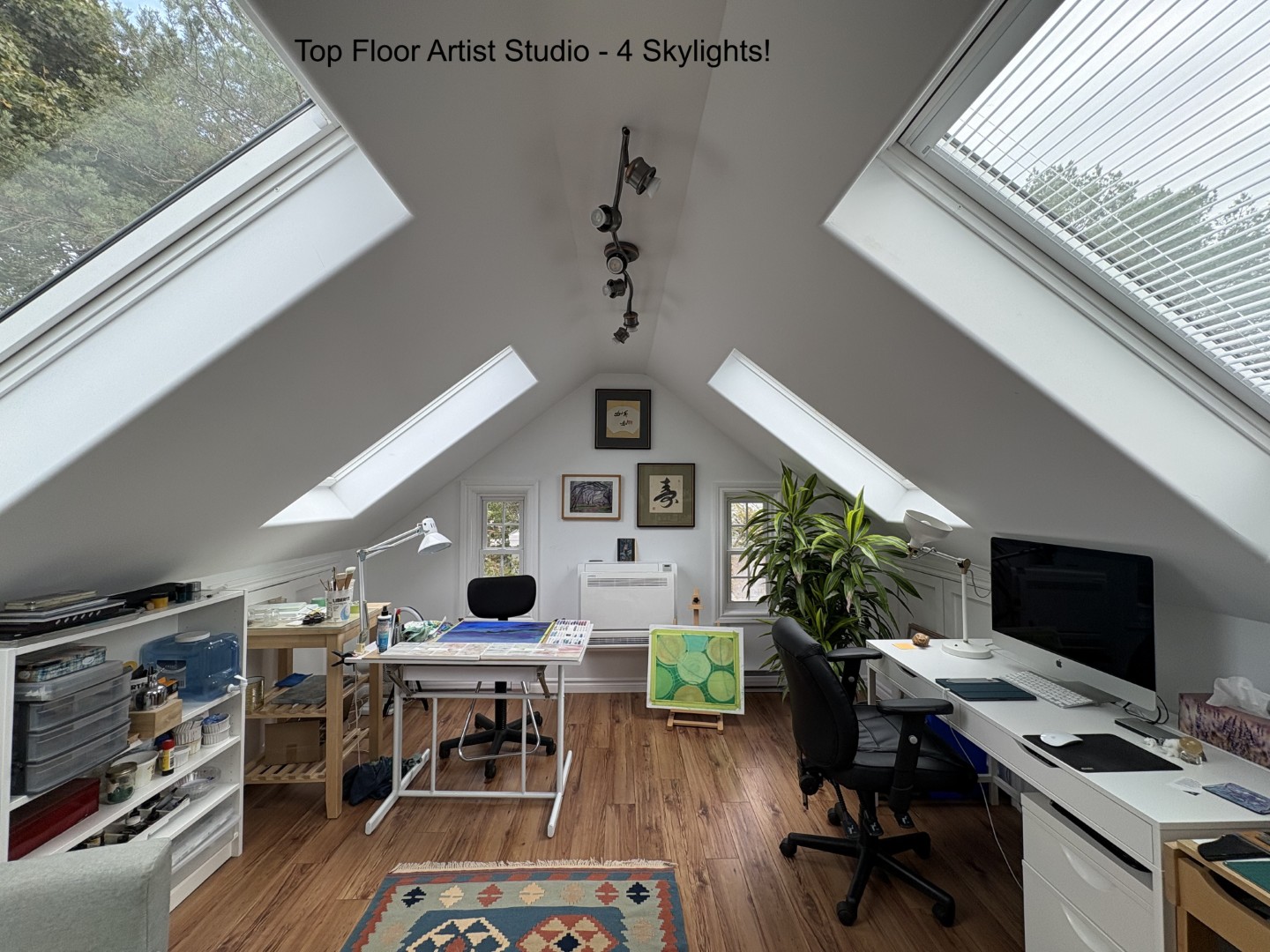 Second level has two bedrooms, one with a Queen bed, the other with a Double, one full bath and a 3rd room currently being used as an exercise/yoga room (with space for a 3rd bed if required). The third level has a light filled artist studio with the aid of 4 skylights!