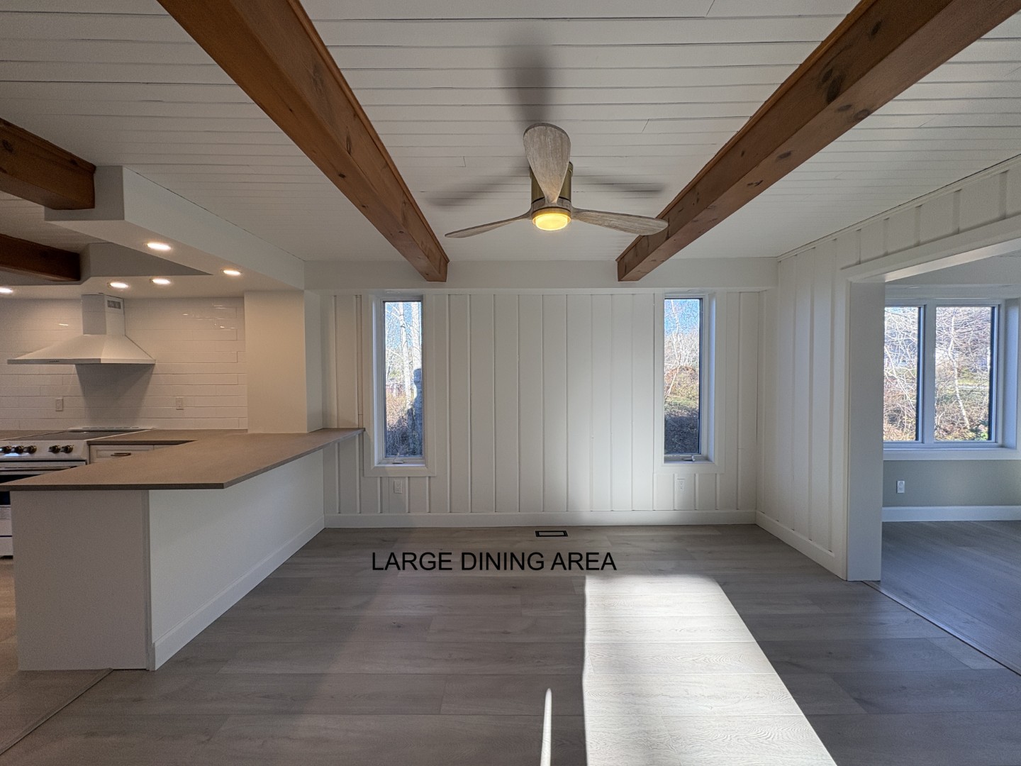 Exposed wooden beams lend a warm and rustic feel throughout the space. Gorgeous views of Fletchers Lake from the rear deck. Dock is shared with your immediate neighbors only.