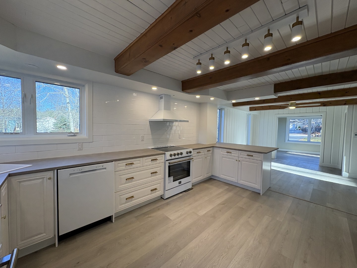 Enter the home into a spacious sunroom leading to a large dining area and brand-new kitchen. The dining area leads to the living room which opens to a family room with electric fireplace and patio doors to your deck. Laundry on the main floor.