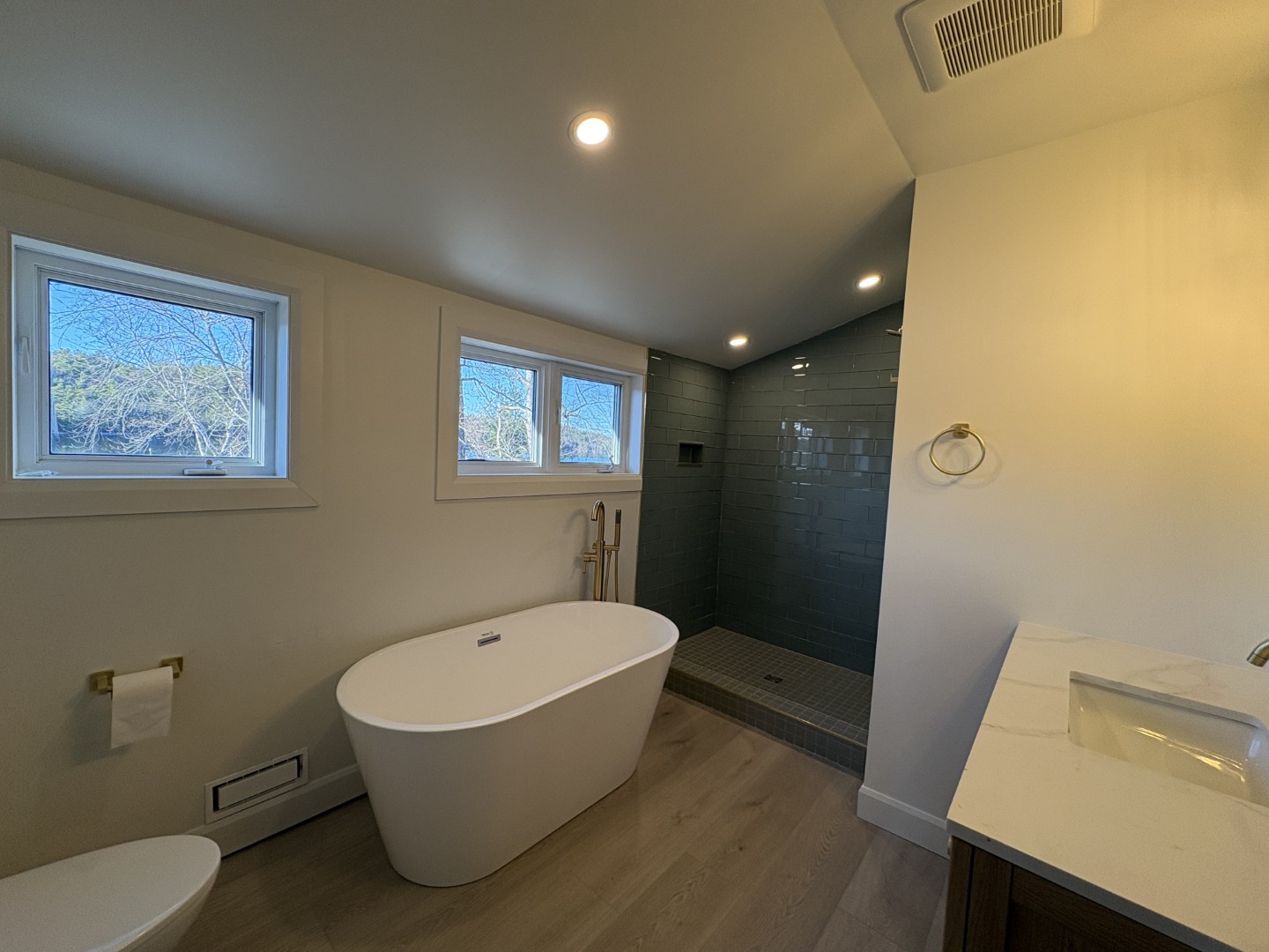 Upstairs you'll find two bedrooms, the primary with two closets. Beautiful 4-piece bath with soaker tub and custom-built shower.