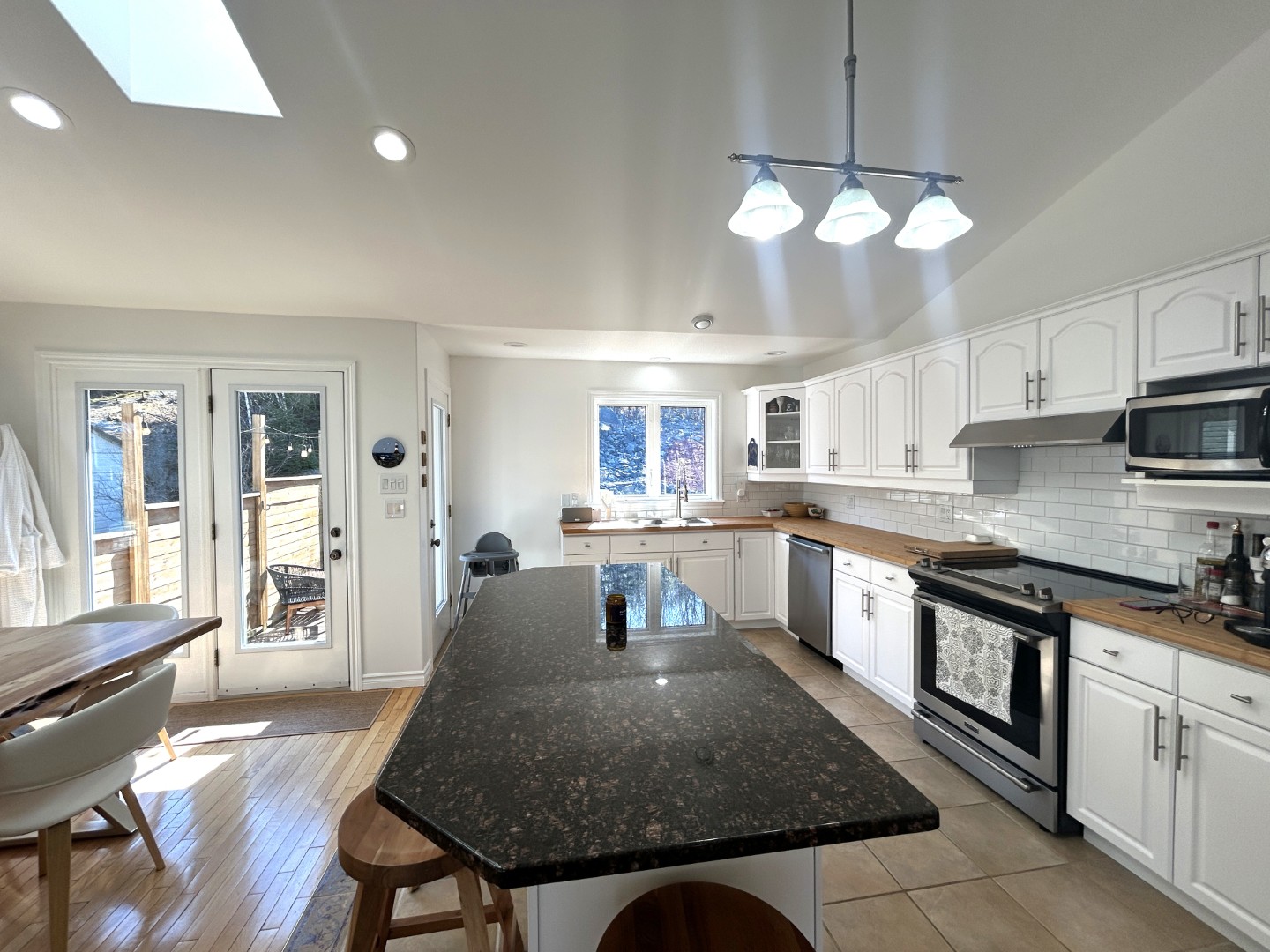 Gorgeous extended foyer, open concept living area/kitchen with vaulted ceiling and skylights, ideal for entertaining or everyday family living. 3 bedrooms up with lovely ensuite with jacuzzi, 4' shower and walk-in closet. 3 full bathrooms.