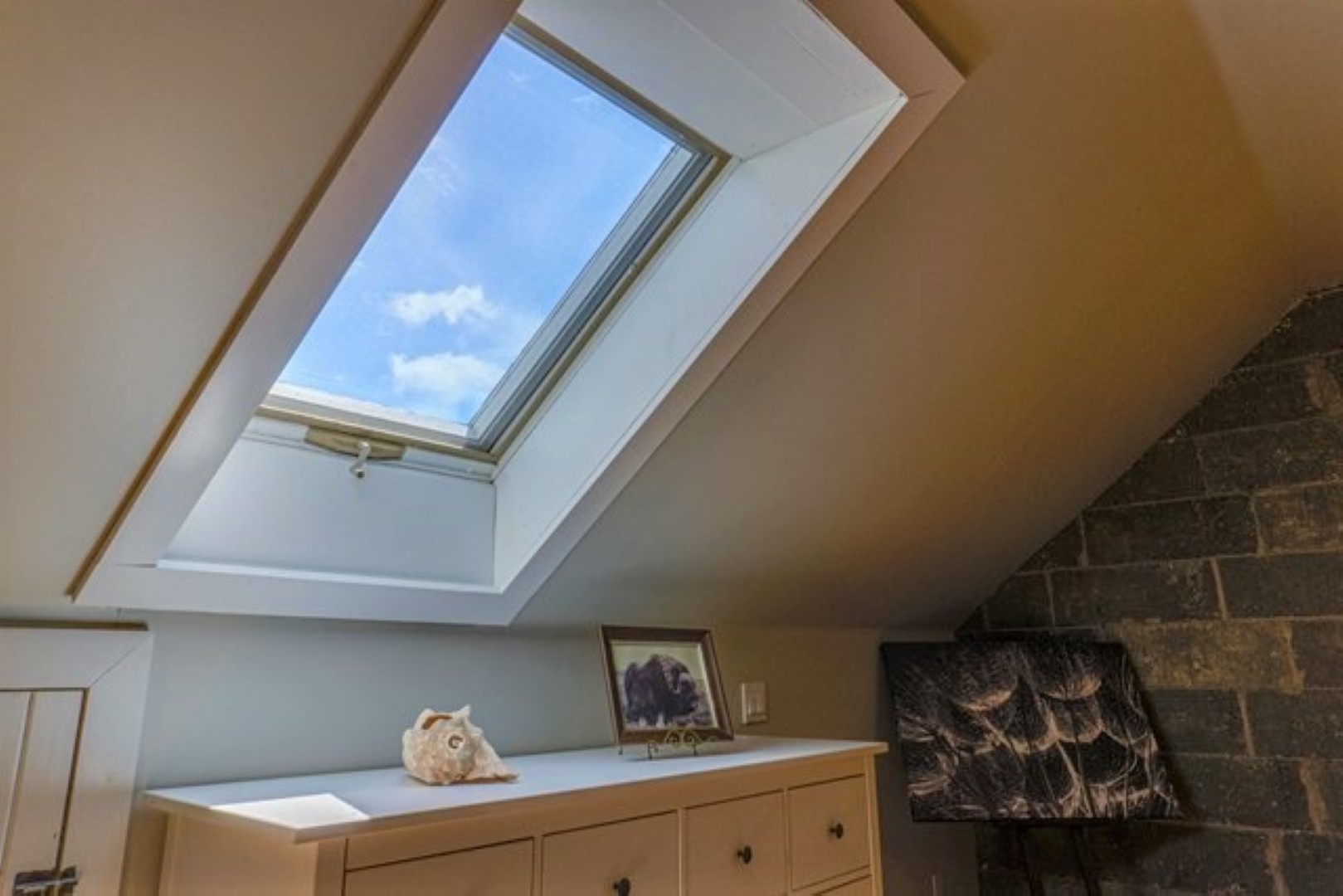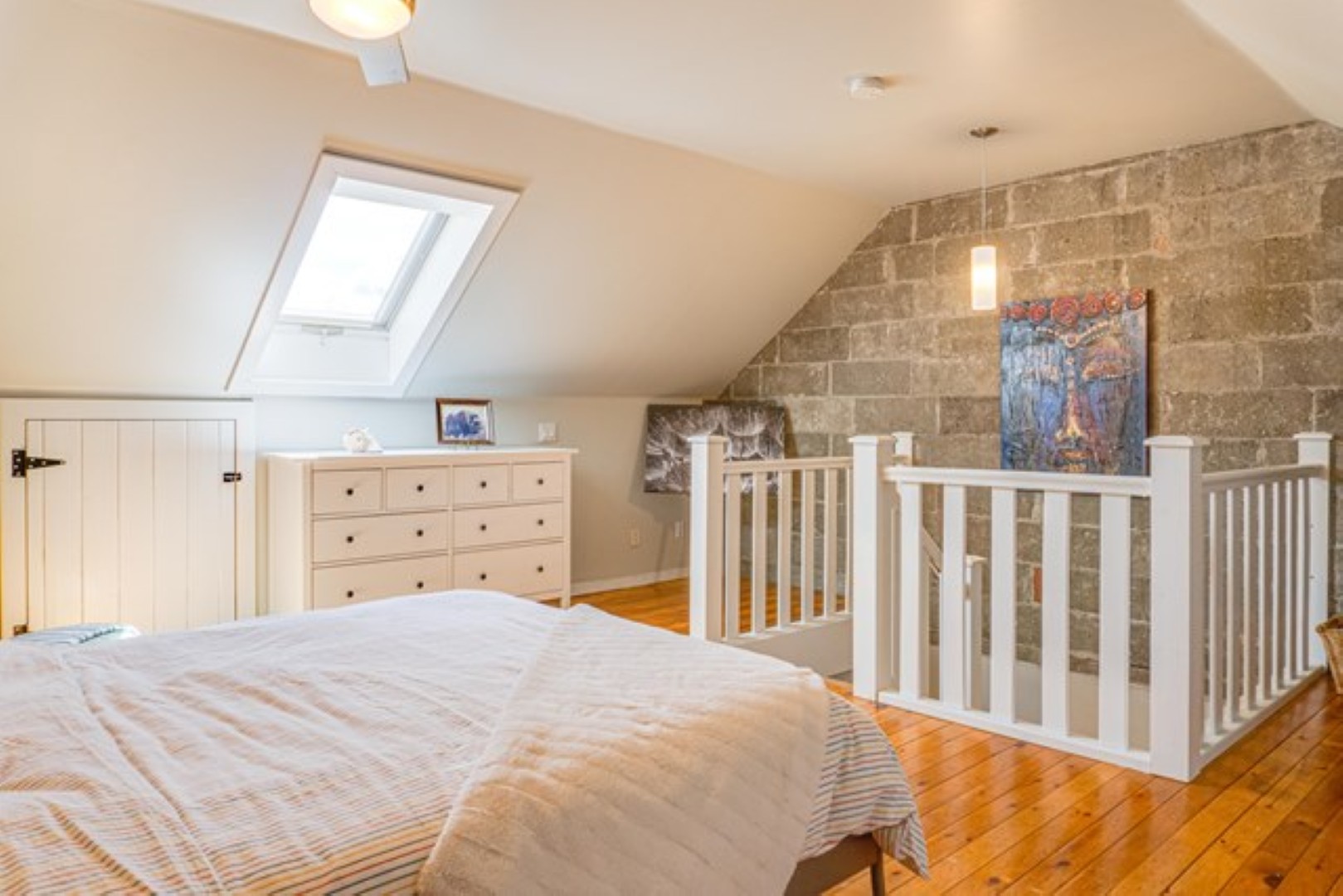 Primary bedroom in the attic with charming, exposed brick wall. Two additional bedrooms plus full bath on the second level.