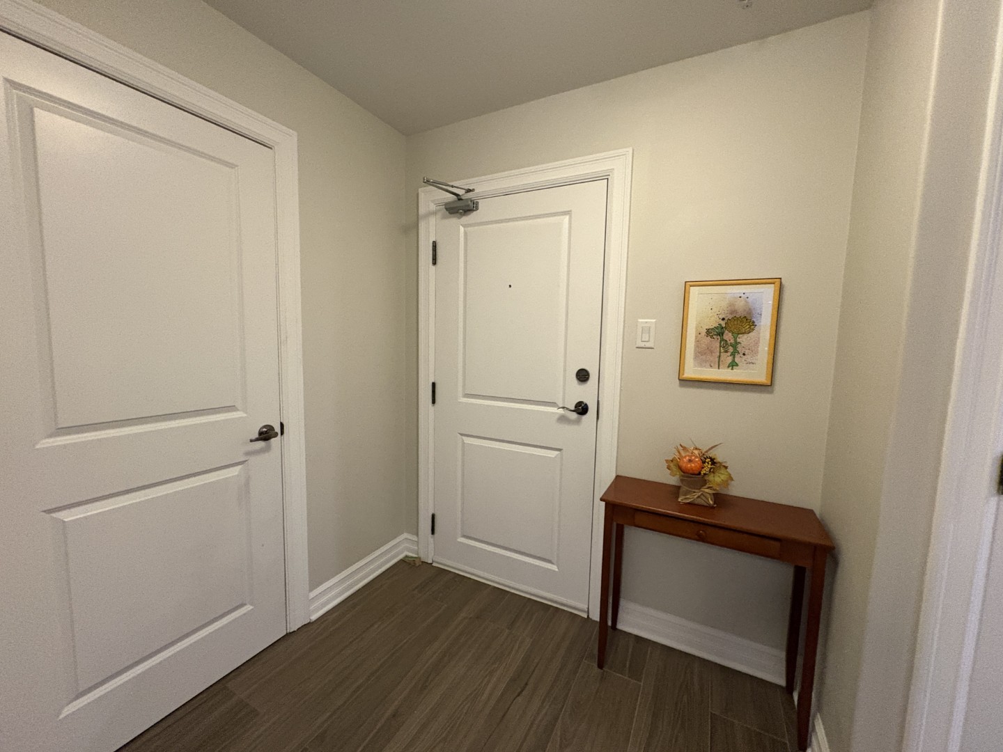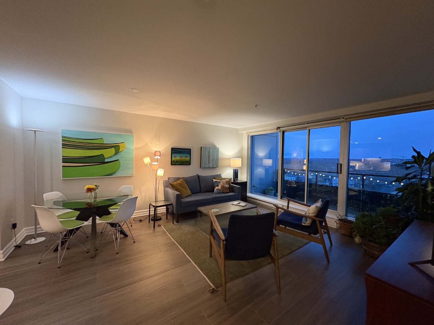 Spacious entryway leads into a large and bright living room with modern, comfortable furniture, beautiful artwork and a balcony facing the sunny west side. Large bedroom with gorgeous skyline views and walk-in closet.