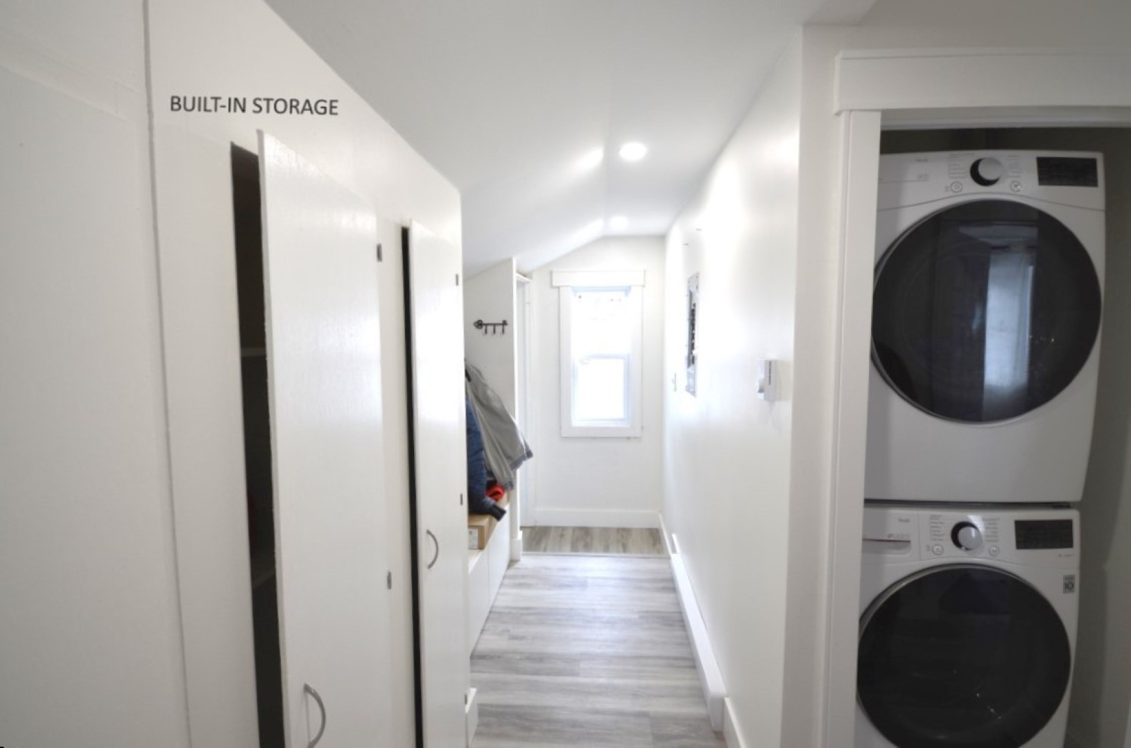 Ductless mini split in the living room will ensure this lovely flat stays warm in the winter and cool in the summer. Stackable laundry. Built in storage in foyer. A second shared foyer inside main door.