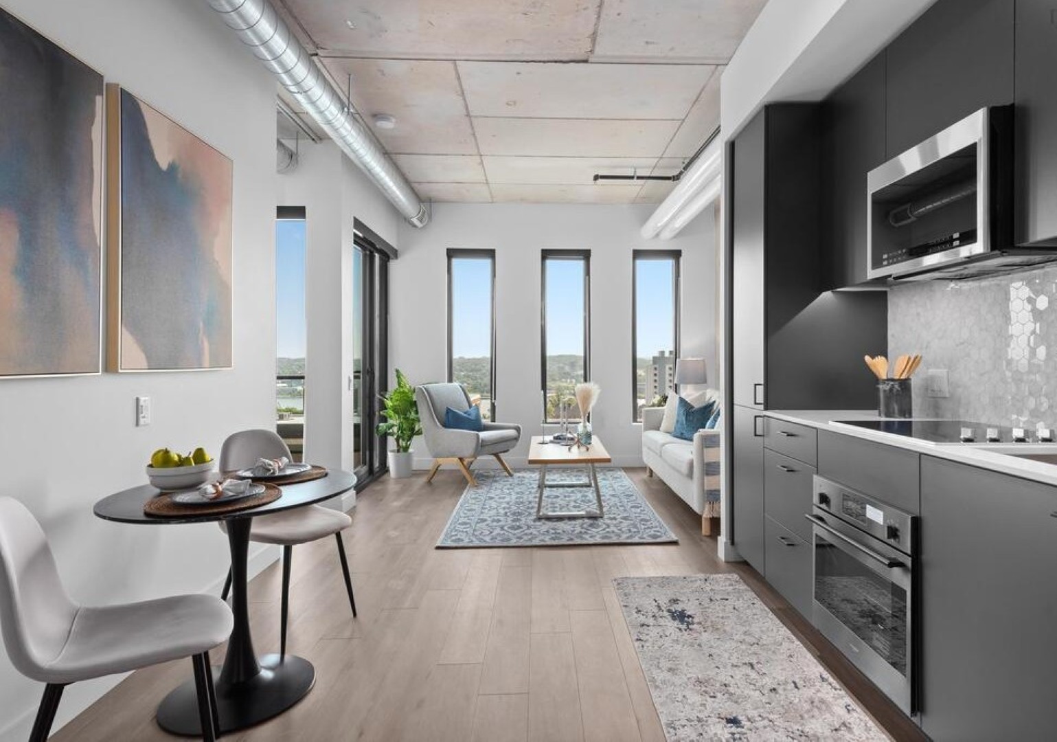 Beautiful modern kitchen with space for a small table, wall oven, stove top, dishwasher, microwave and a refrigerator which blends into the cabinetry. Living area has large windows offering a spectacular view and opens onto a 46 ft sq balcony.