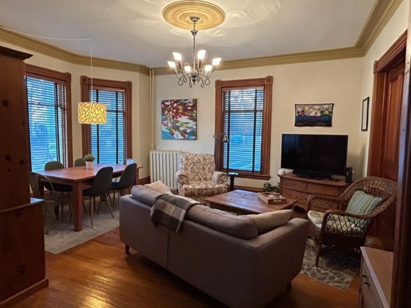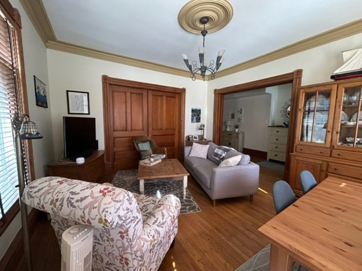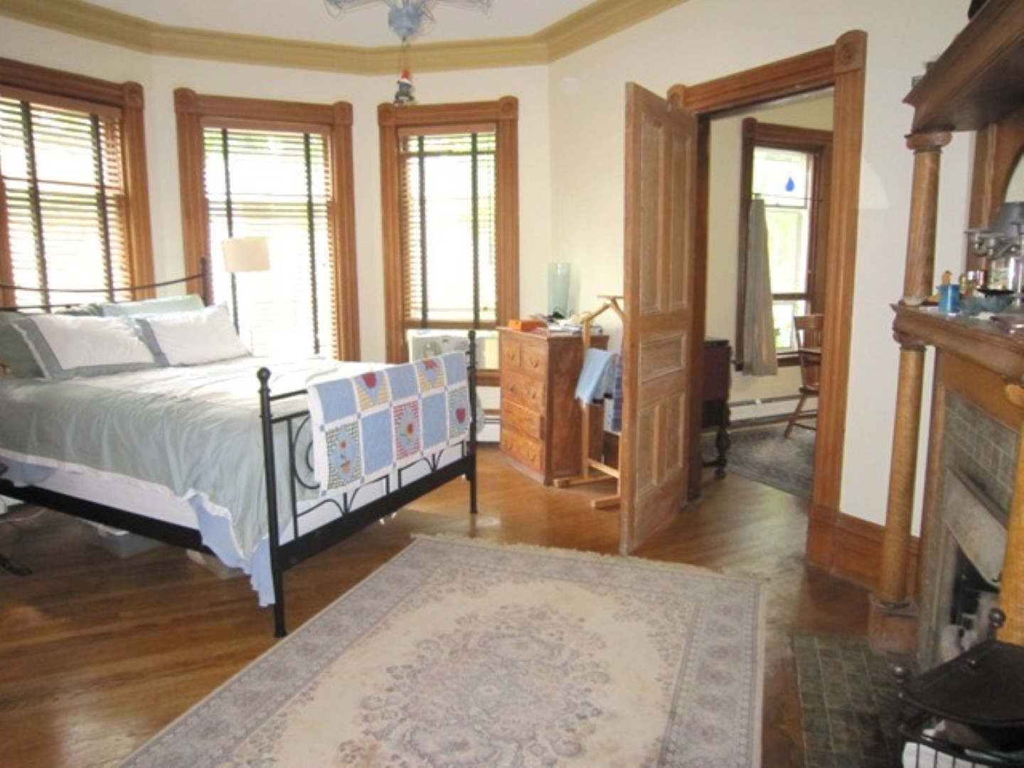 Hardwood and tile floors throughout; original pocket doors and wood trim, high ceilings, cove mouldings and ornamental fireplaces, one with oak mantle. Two large rooms may be used for either living or bedrooms and another large room can be used as a den or dining room.