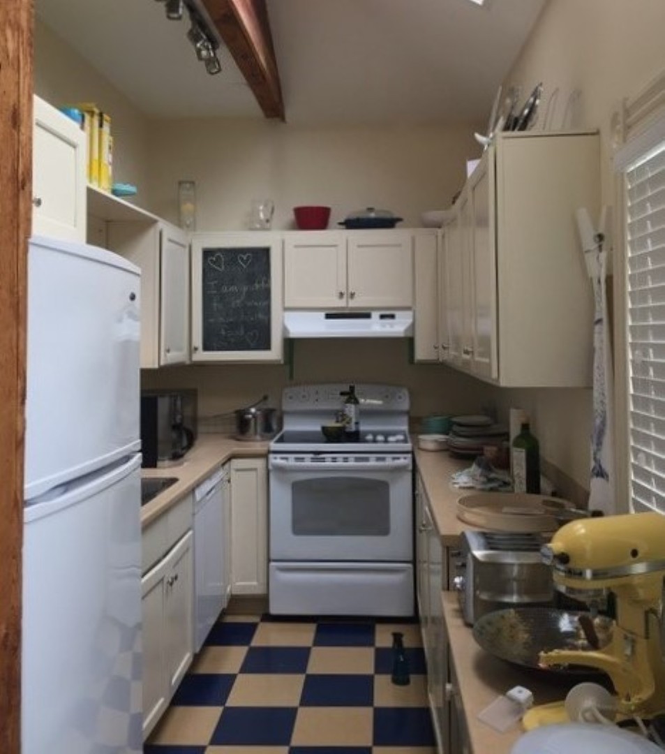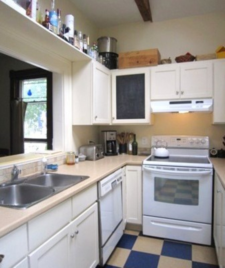 Galley kitchen has exposed beams plus a small breakfast area. Range, fridge and dishwasher provided. Back entrance mudroom leads down to the basement laundry/storage room with private washer/dryer.