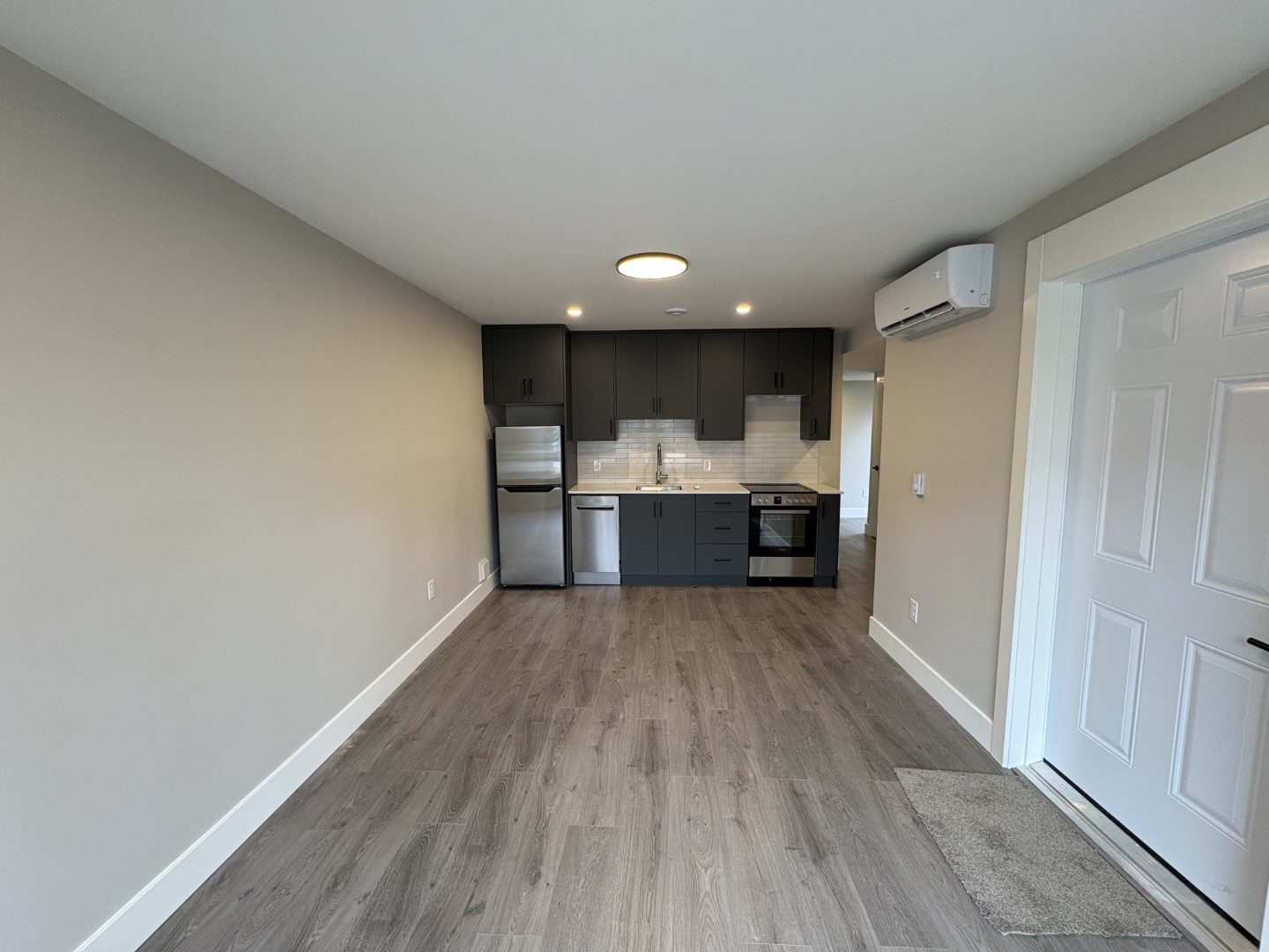 Open concept kitchen, dining and living area. Huge windows in living area flood the space with natural light. All new appliances in kitchen including a dishwasher and rangehood microwave. Two bedrooms and one full bath.