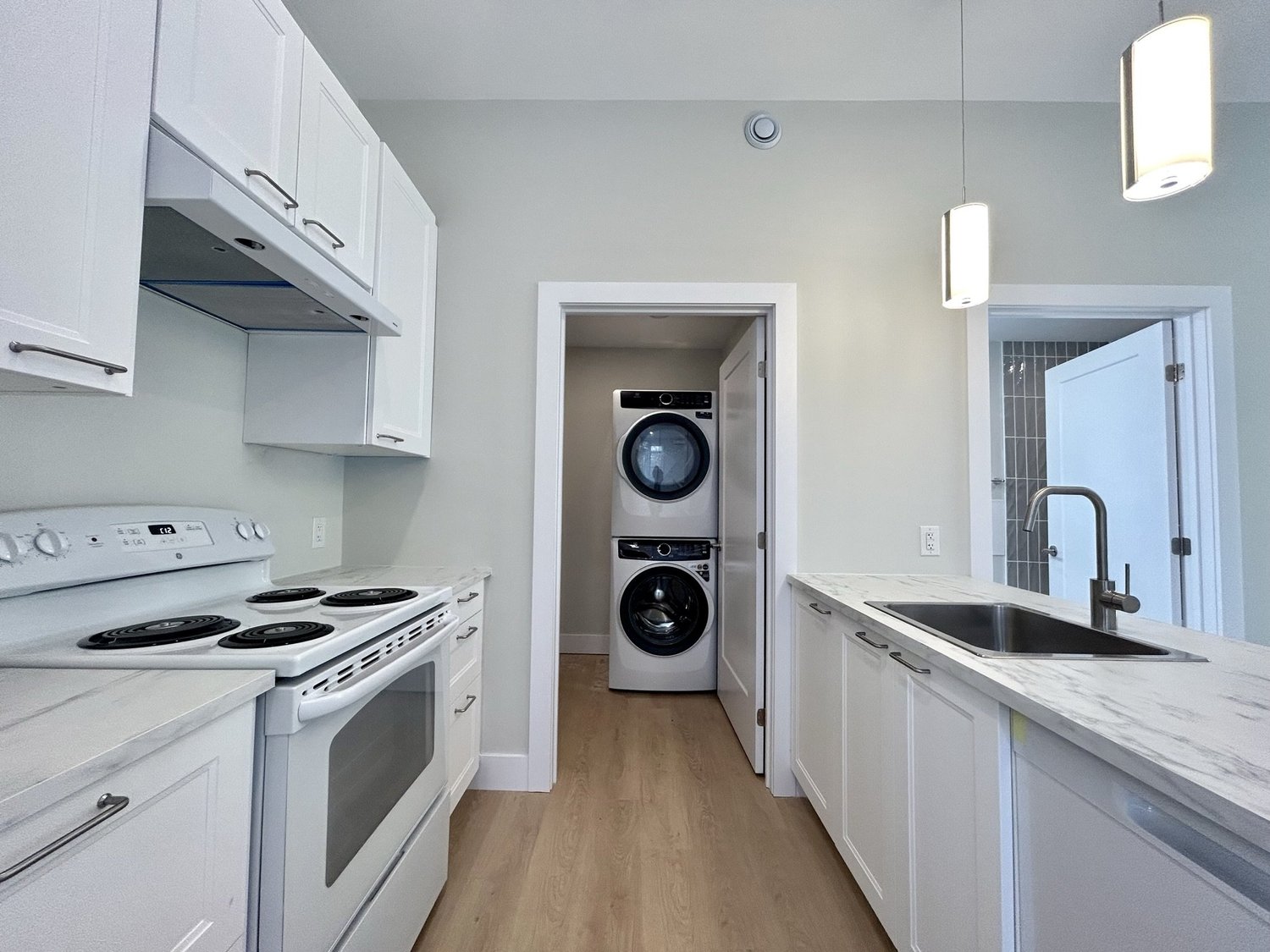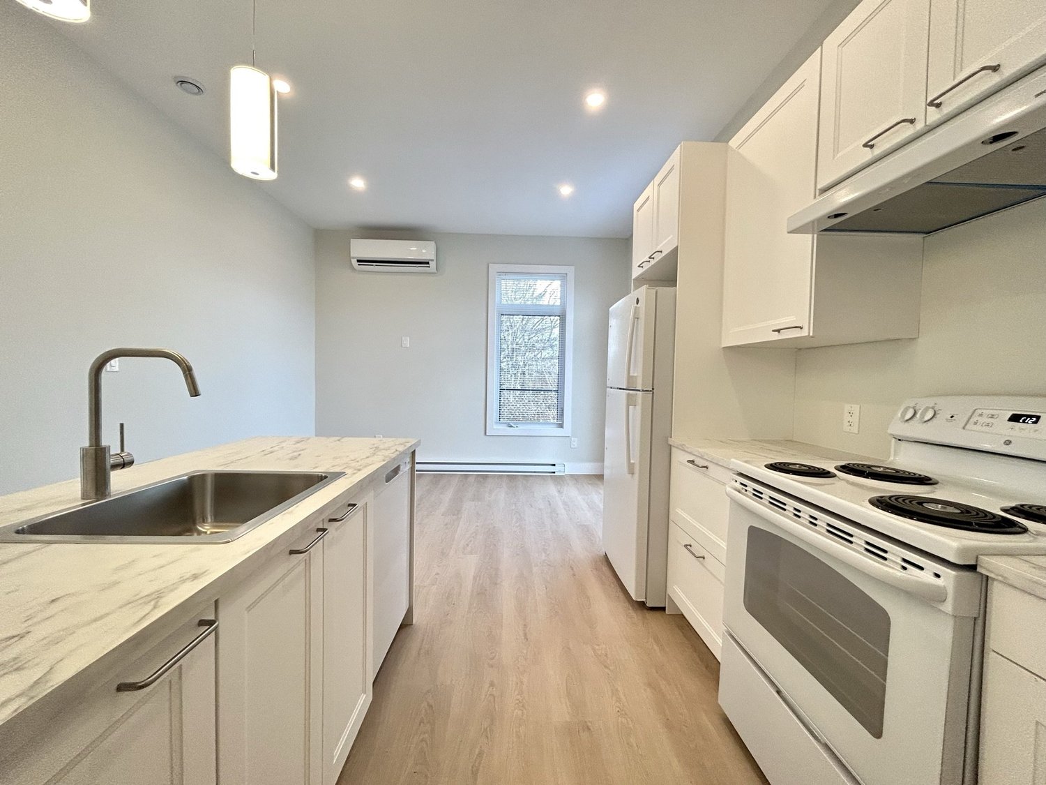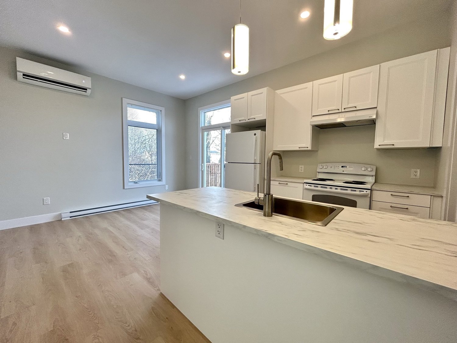 Open concept kitchen, living and dining area with ductless heat pump. Kitchen has fresh, white cabinetry and a large breakfast bar offering ample counter space.