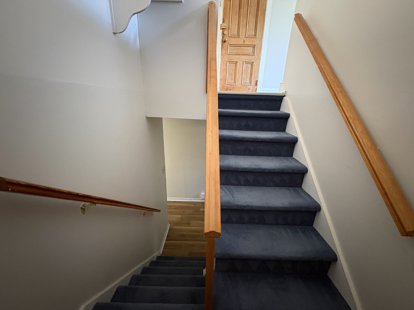 Main floor has a large, bright living room at the front of the building, a galley style kitchen and a dining area with doors to patio at the back. Lower level has two good sized bedrooms and full bath. Laminate flooring throughout with carpet on stairs only.