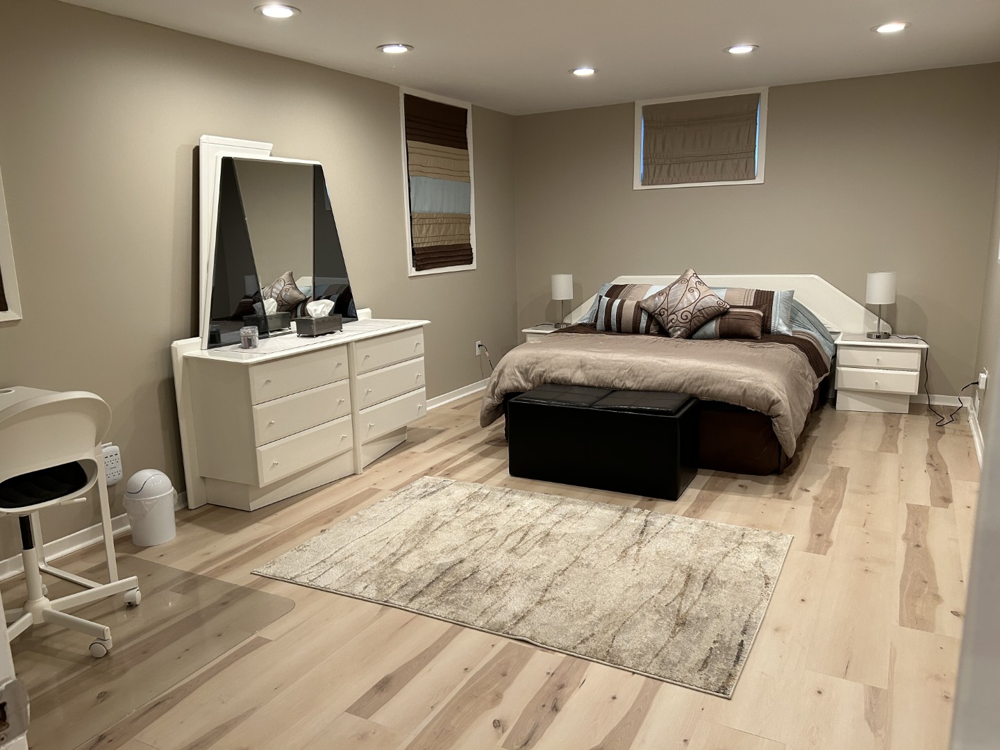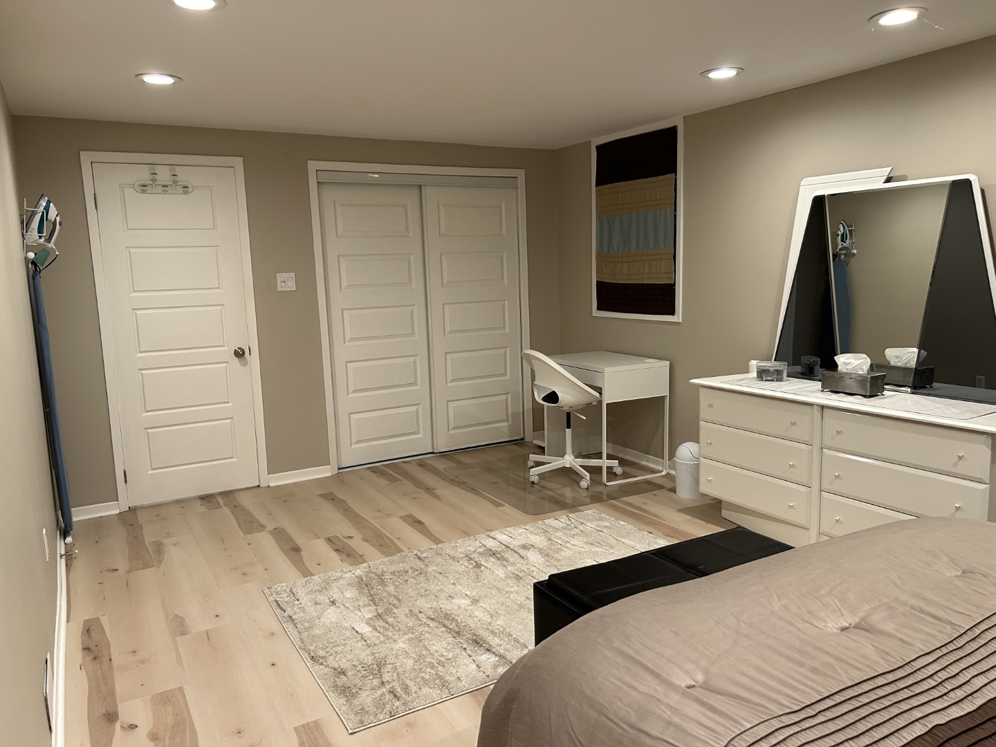 Large primary bedroom with Queen bed, large closet and small computer desk. The flex room has a computer desk and bookcase and can also be used as a guest bedroom with closet and sectional sofa bed.