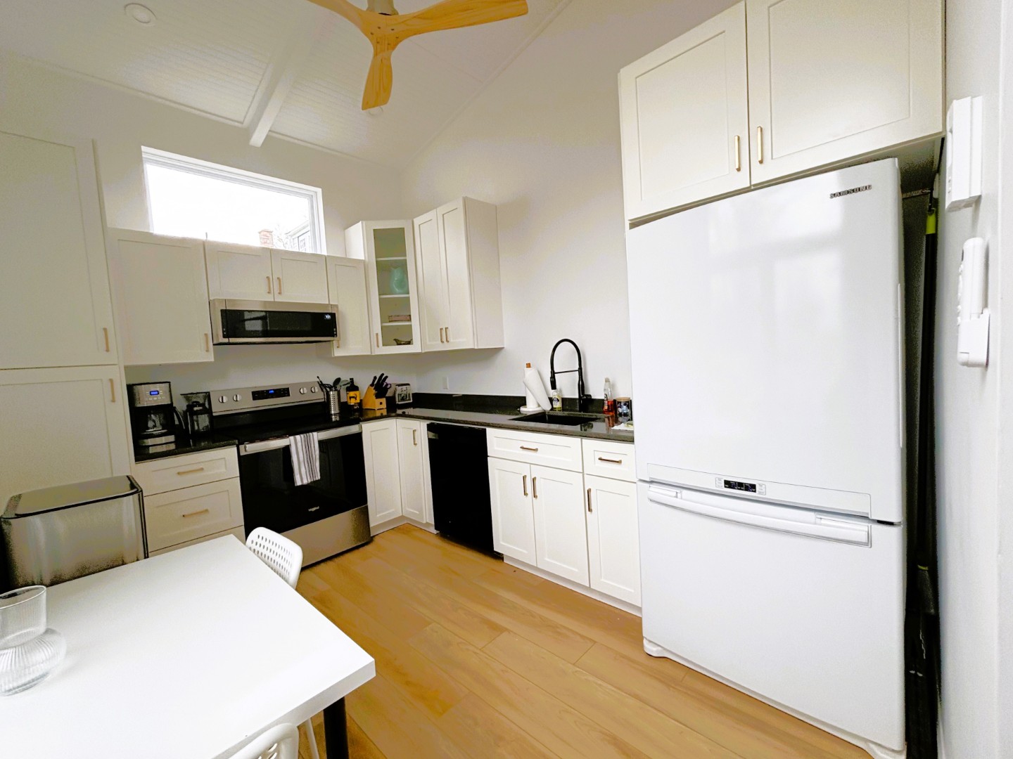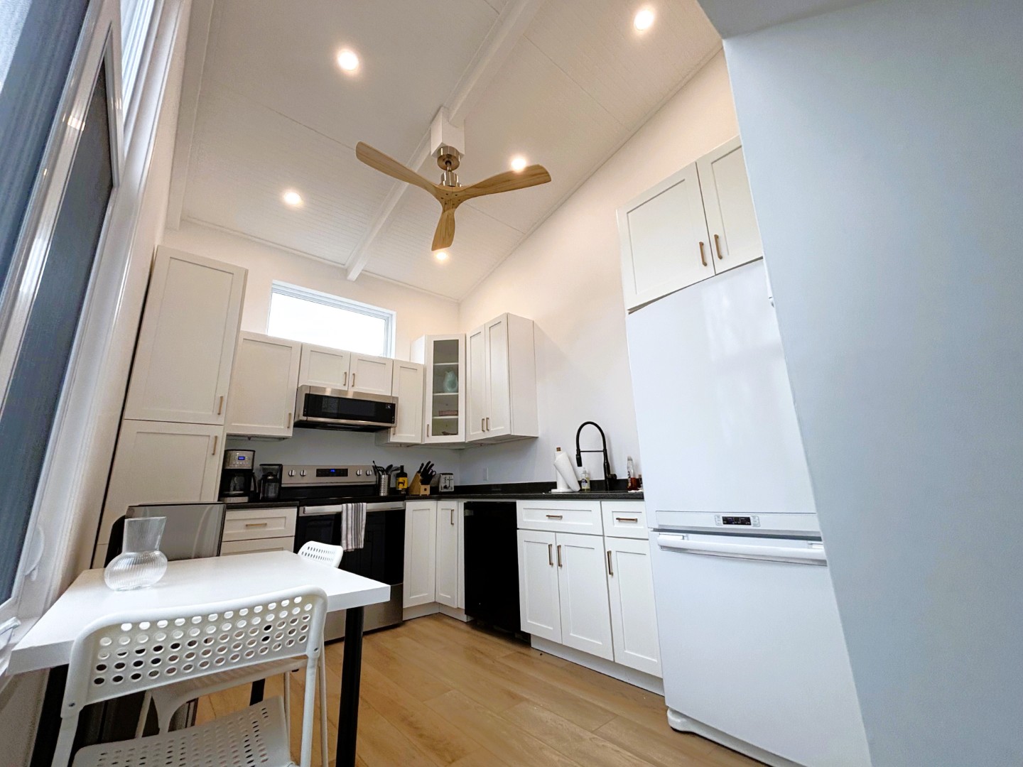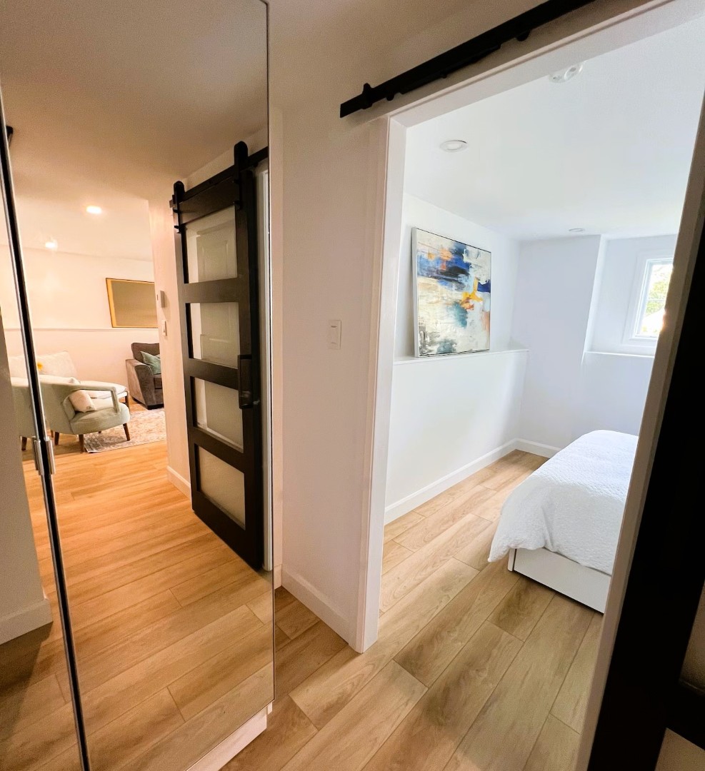 A barn door opens to the bedroom which is sleek and clean with a queen bed. Fabulous bathroom. In-unit laundry. Sundeck.