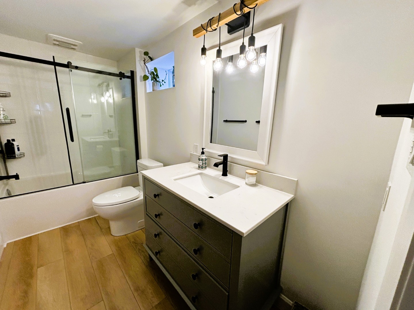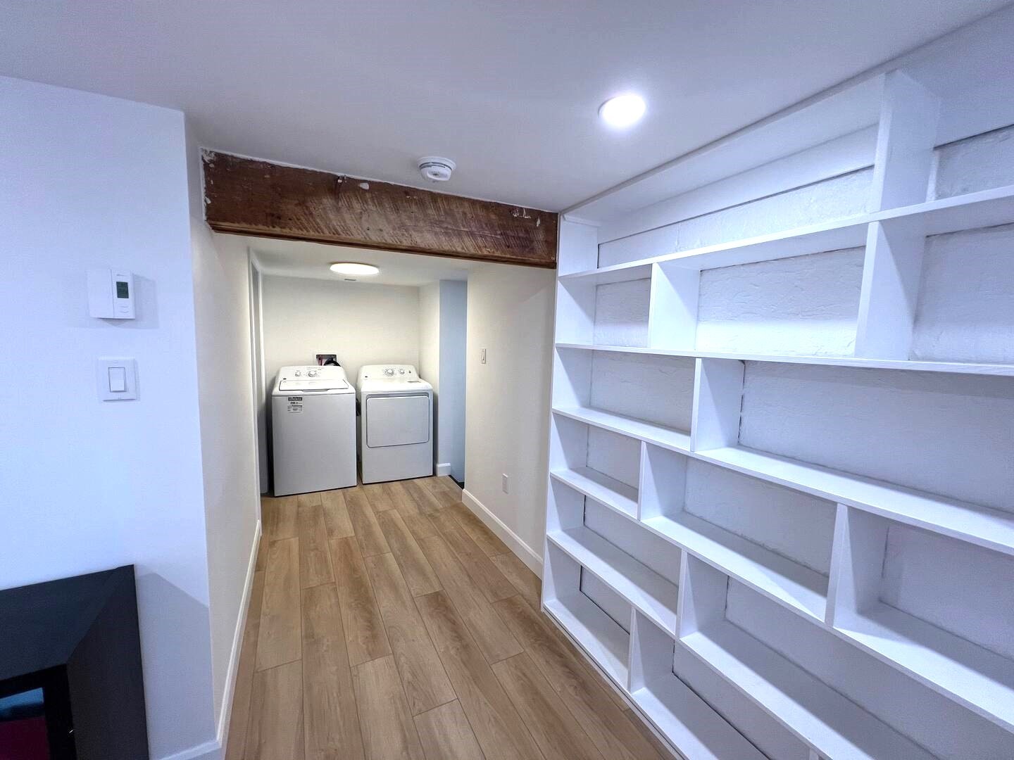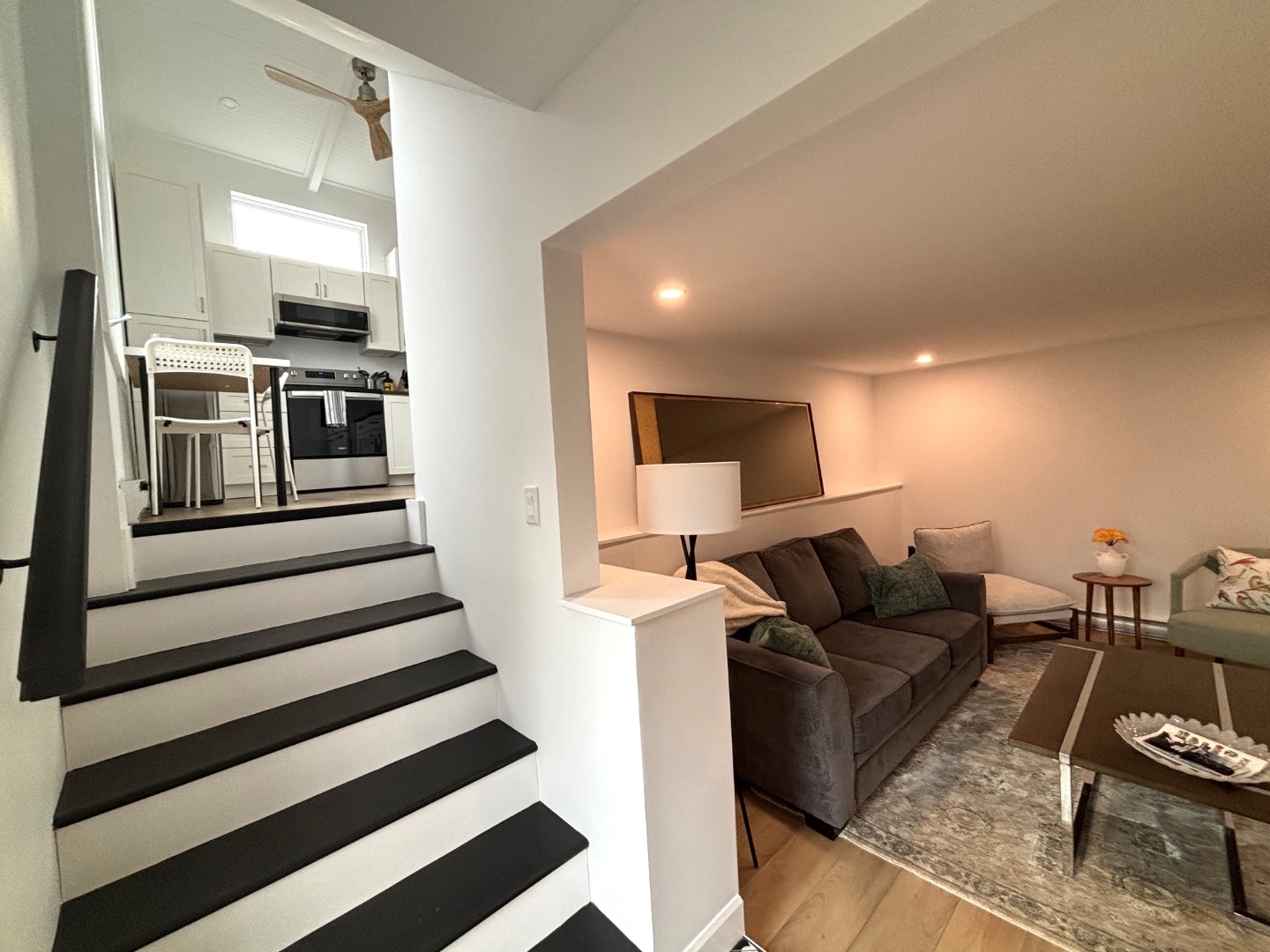 A barn door opens to the bedroom which is sleek and clean with a queen bed. Fabulous bathroom. In-unit laundry. Sundeck.