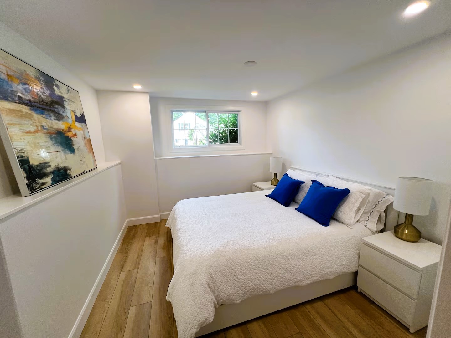 Private entrance takes you into a light and airy space, comfortably furnished and fully equipped. Renovated kitchen with a vaulted ceiling overlooks the back garden and has a small table and chairs. The home office includes a huge shelving unit and a desk providing a great space for anyone who works from home.