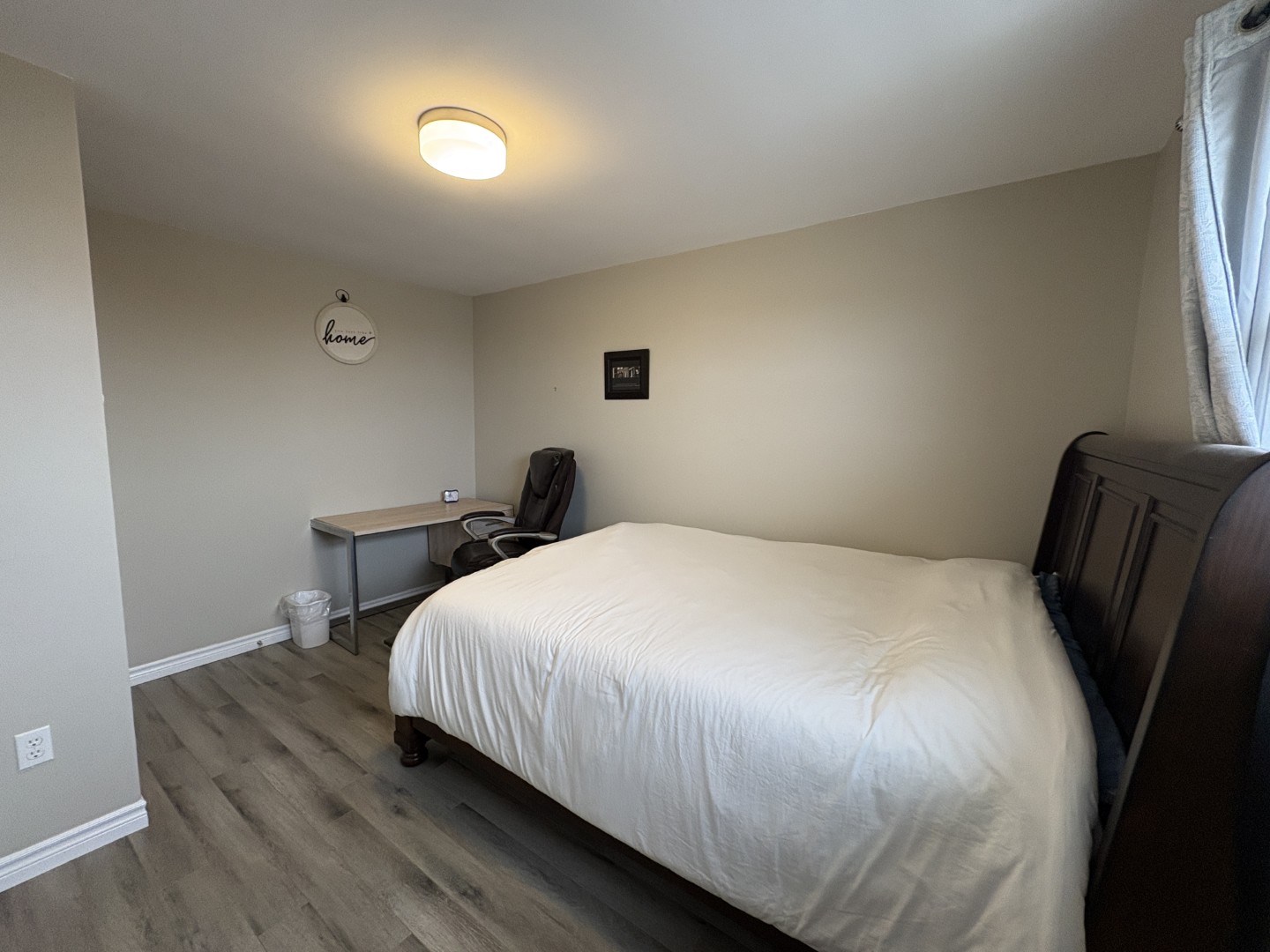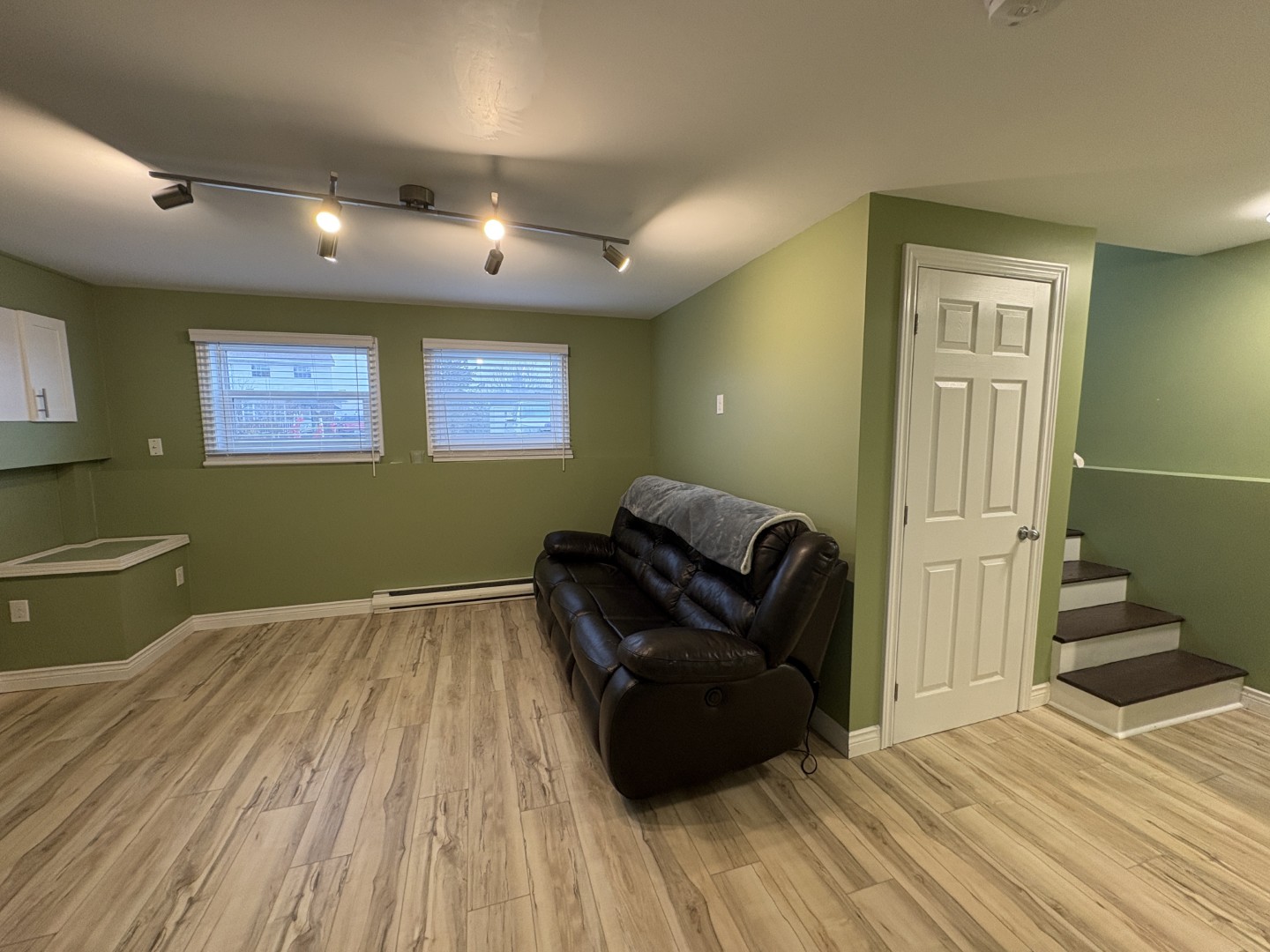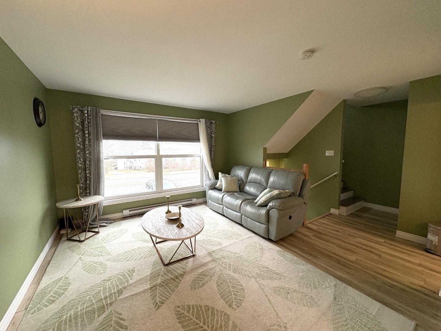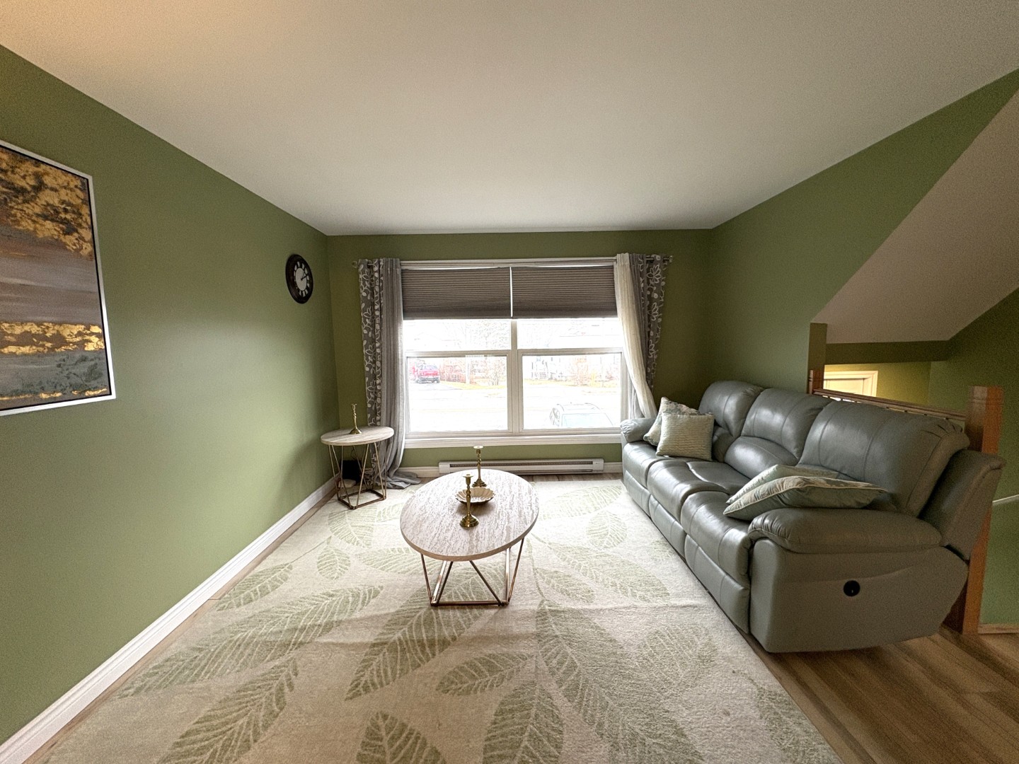 Patio doors to back deck and yard. Spacious and comfortable living area with large windows and laminate flooring.
