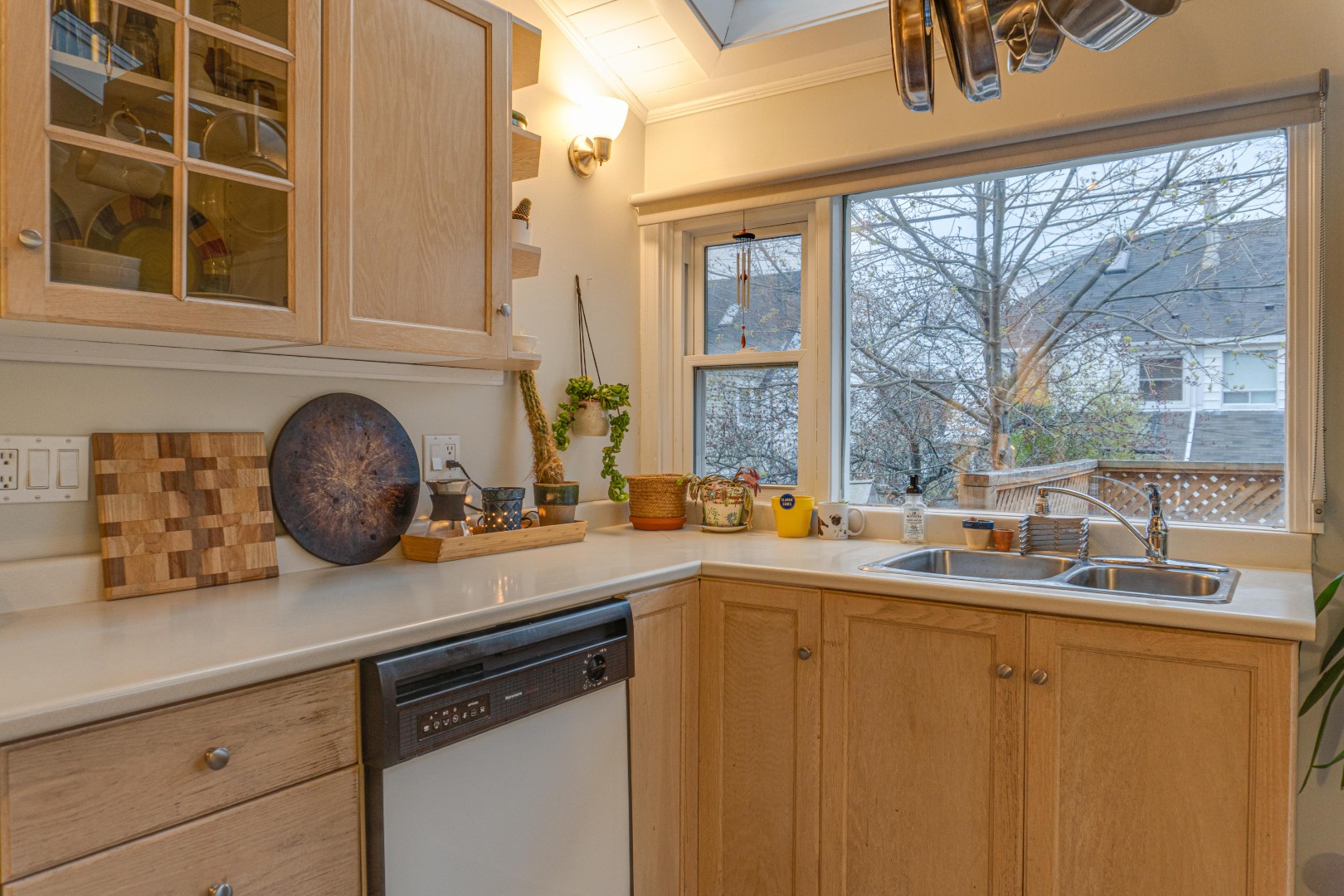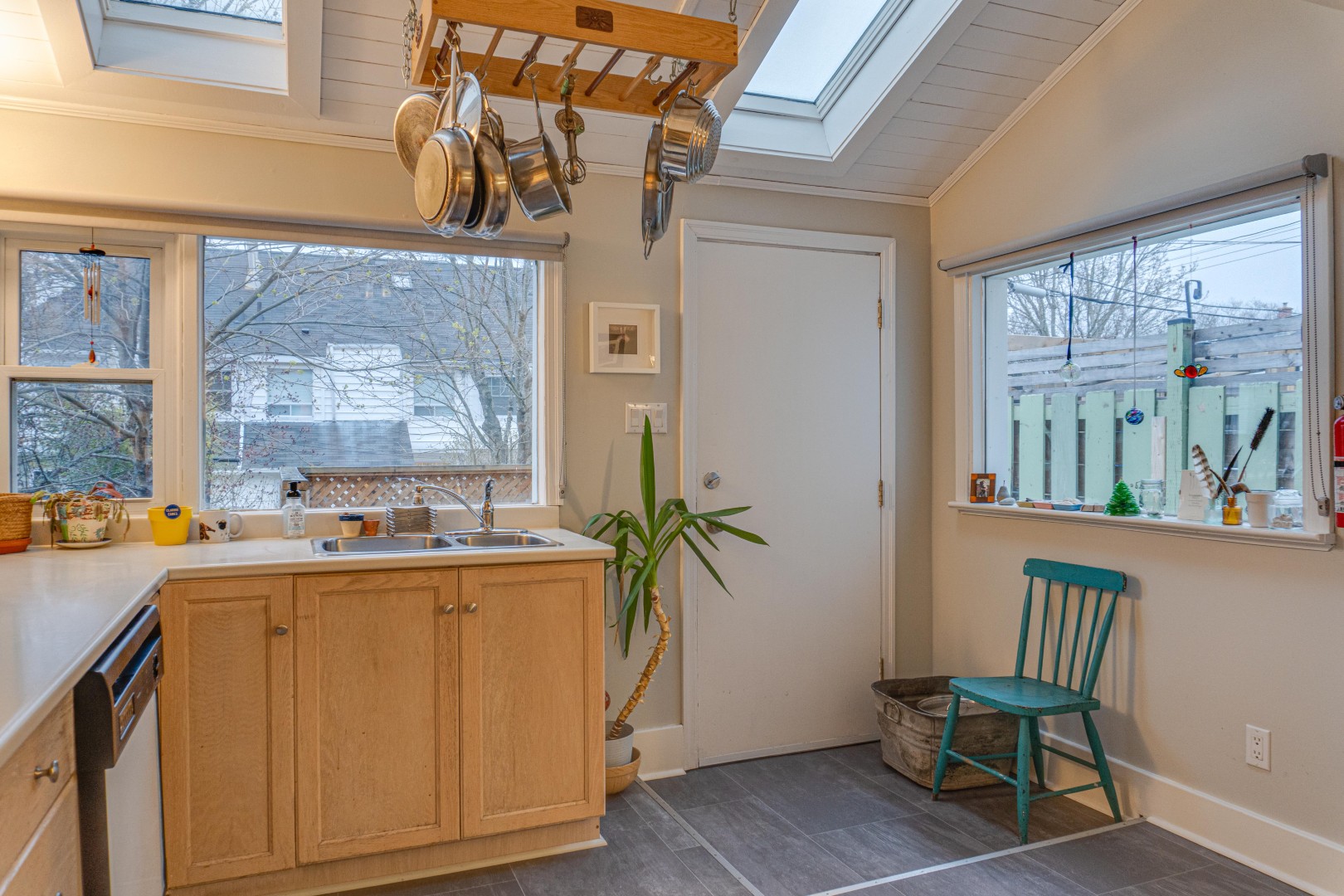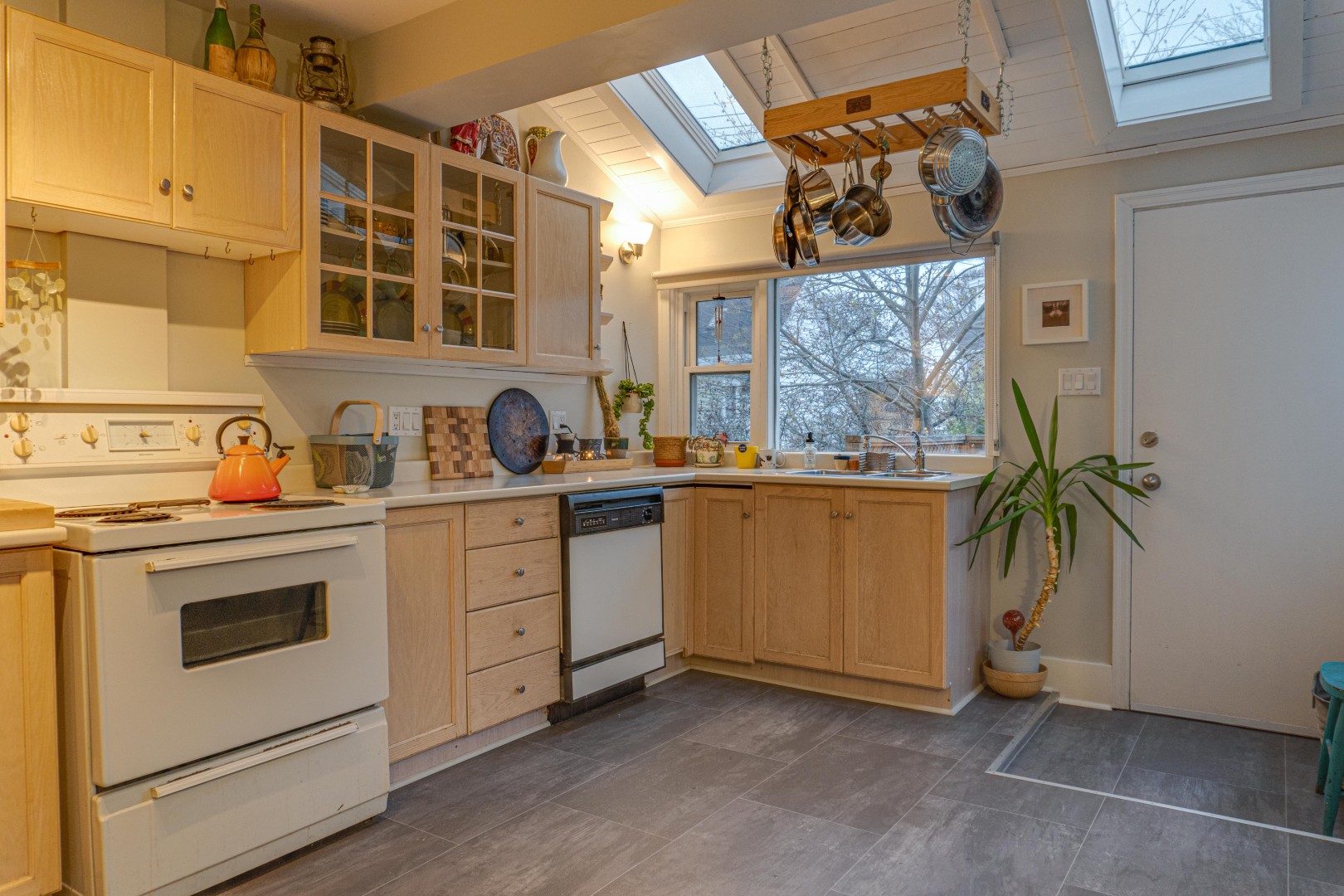 Three bedrooms plus full bath on the second level. Lovely attic space with charming, exposed brick wall offers additional flex space. Large living room. Big bright kitchen with skylights, lovely wooden cabinets, and ample room for a large table. Hardwood flooring throughout.